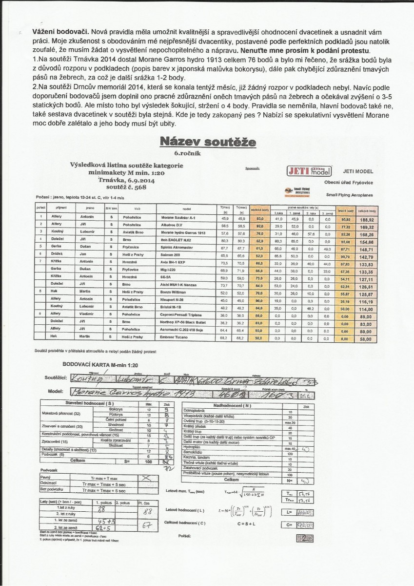 Mám pocit, že hlavní bodovač má představu, že dvacetinky musí vypadat jako létající kity. Potlačené body za klasickou konstrukci a neúměrně vysoké za tvrdou polystyrenovou konstrukci, která je sice vzhedově perfekní plechová, ale u typů z W.W.I potažených plátnem je velmi vzdálená skutečnosti a hlavně postrádá jakoukoliv vnitřní konstrukci, která má být podle nových pravidel patřičně hodnocena!