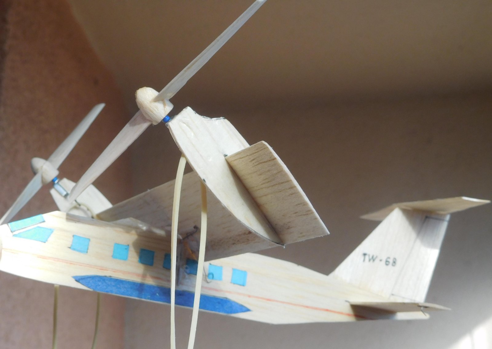 Takže makičký prcek dokázal ve 12m vysoké hale v Prostějově letět 47 s, což ma ty 5 tilisté vrtule je slušný výkon, se dvoulistkami by to asi bylo lepší. U toho stínáku bylo funkční překlopné křídlo, v tak malém modelu je obtížné celý mechanismus udělat spolehlivý i při malé váze. Takže to bylo nespolehlivé. Většinu lepších letů bylo se zablokovaným křídlem v letové poloze.