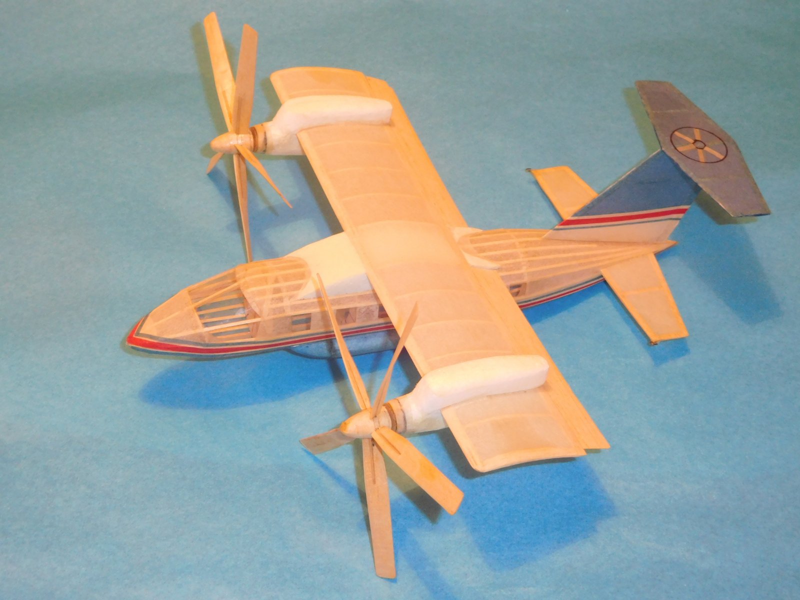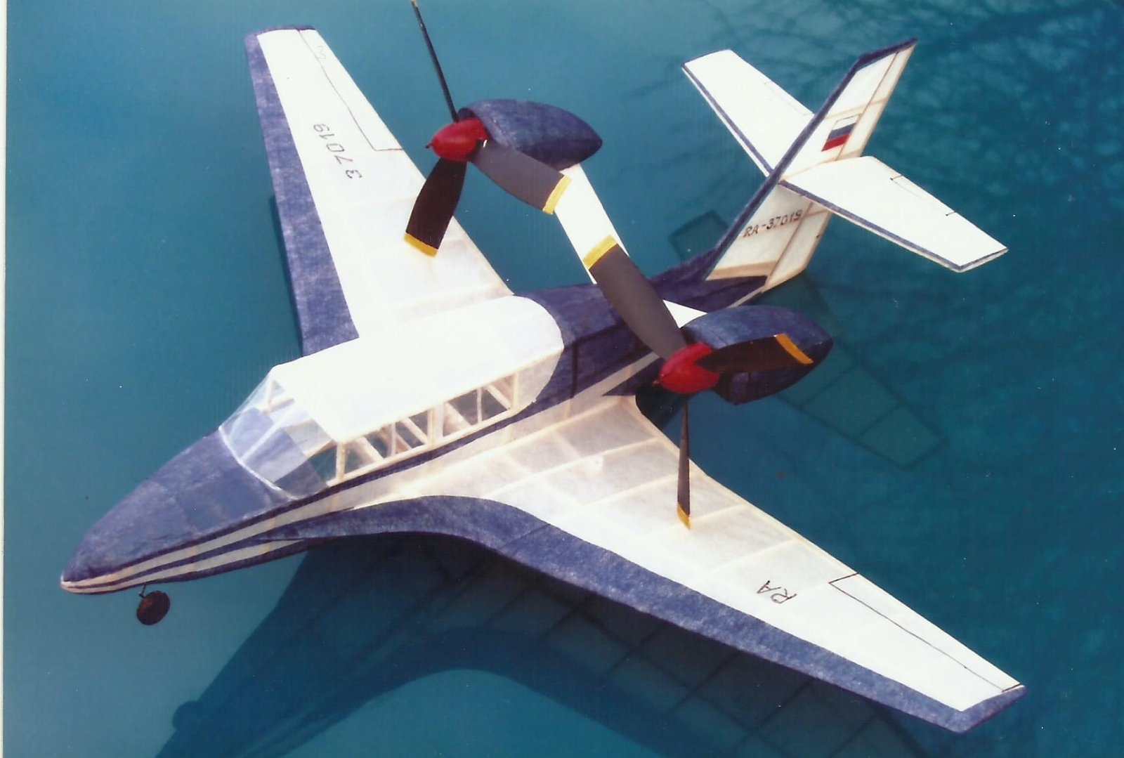 A nyní z jiného soudku. Na začtku tohoto století se v L+K objevila fotka dvoumotorového obchodního letounu - létajícího člunu amfibie Běrjev. Moc se mi líbil, sháněl jsem knihu o konstrukcích Běrjev, ale nakonec se v L+K objevily další fotky a dokonce i 3-pohled. V roce 2006 jsem si tento typ postavil jako oříška a musím říci, že výkony mne zklamaly. V hale nádraží Brno Královo Pole to byly jen lety kolem půl minuty, venku ještě méně. Problém byl, že nosníky motorů byly málo tuhé a při natočení na větší otáčky se kroutily. Asi to ctělo měnší stoupání vrtulí a tenčí svazky. Jenže místo opravy po menším poškození jsem provedl Stráníkovský konec žehem. Později jsem se dočetl, že skutečný letoun měl značné problémy při startu z vody při plném zatížení.