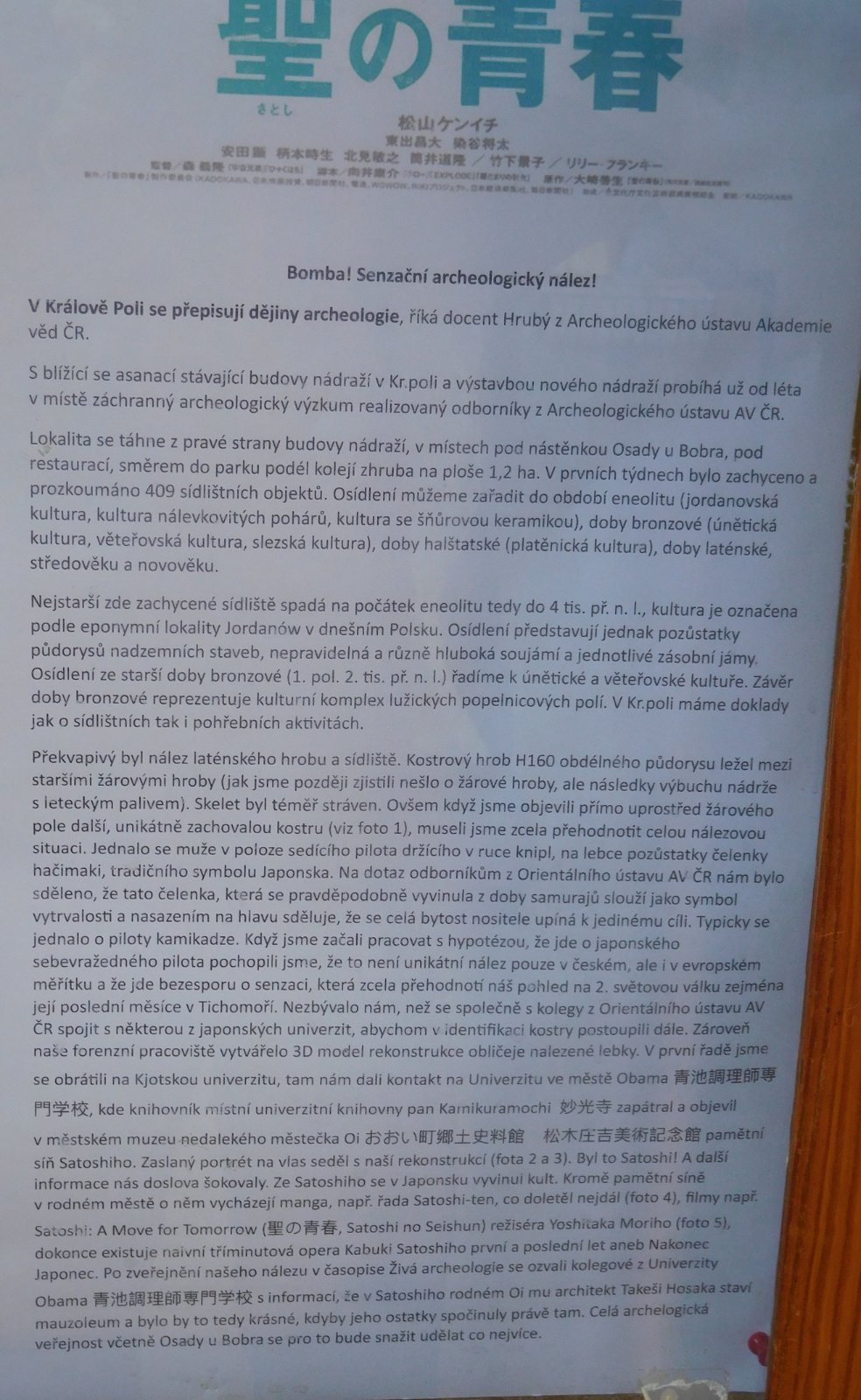 Když jsem to četl tak jsem si říkal, že se snad jedná o Aprílový žert. Mimo pozůstatků sídliště z doby bronzové tam údajně archeologové našli zachovalou kostru pilota s kniplem v ruce, na lebce byl zbytek čelenky s japonskými znaky, Po spolupráci s našim orientálním ústavem a s japonskými institucemi se podařila zjistit identita pilota, byl to Takeši Hosaka a čelenka označovala samuraje. Archeologové naznali, že se jednalo o pilota kamikadze.