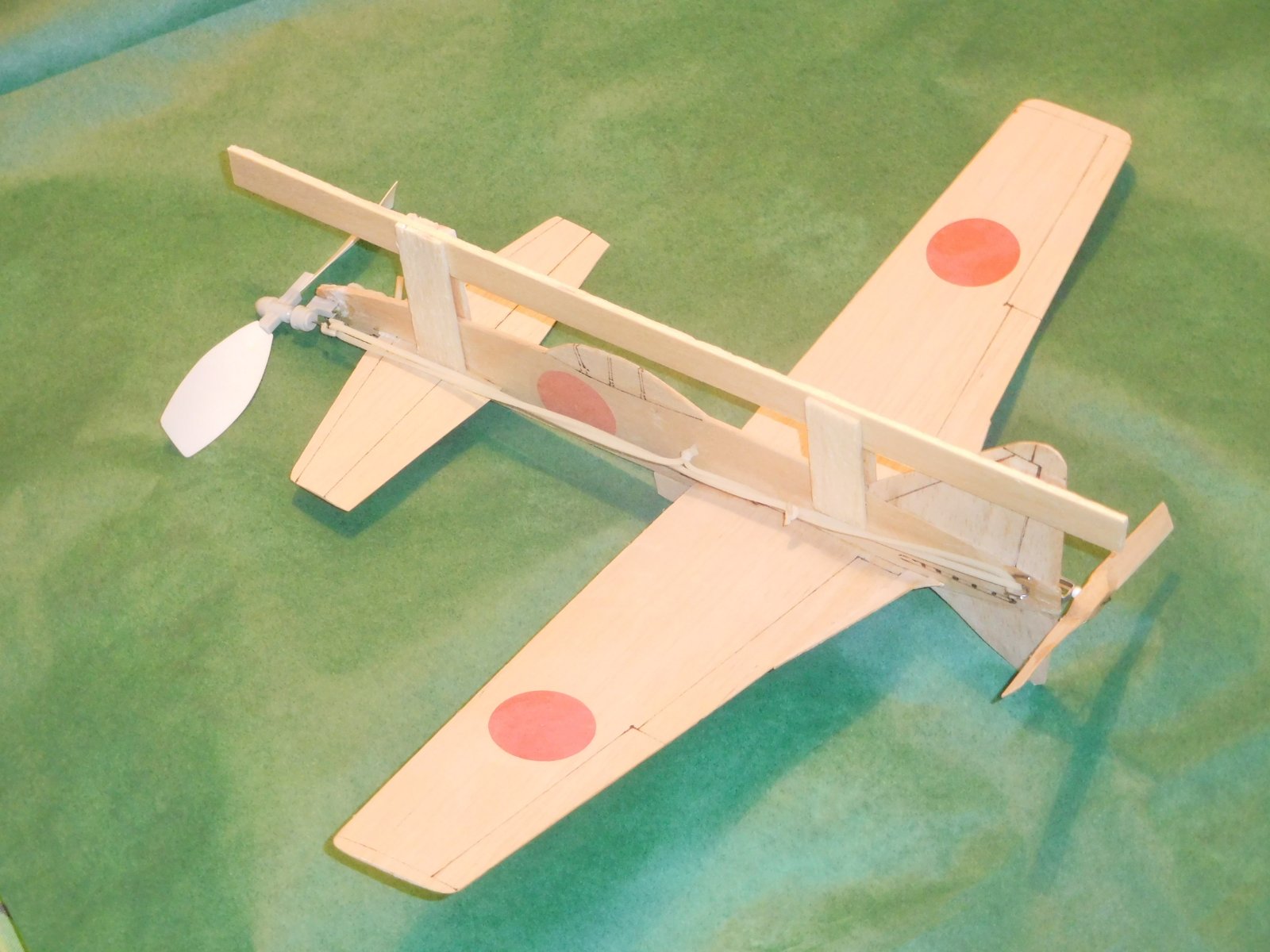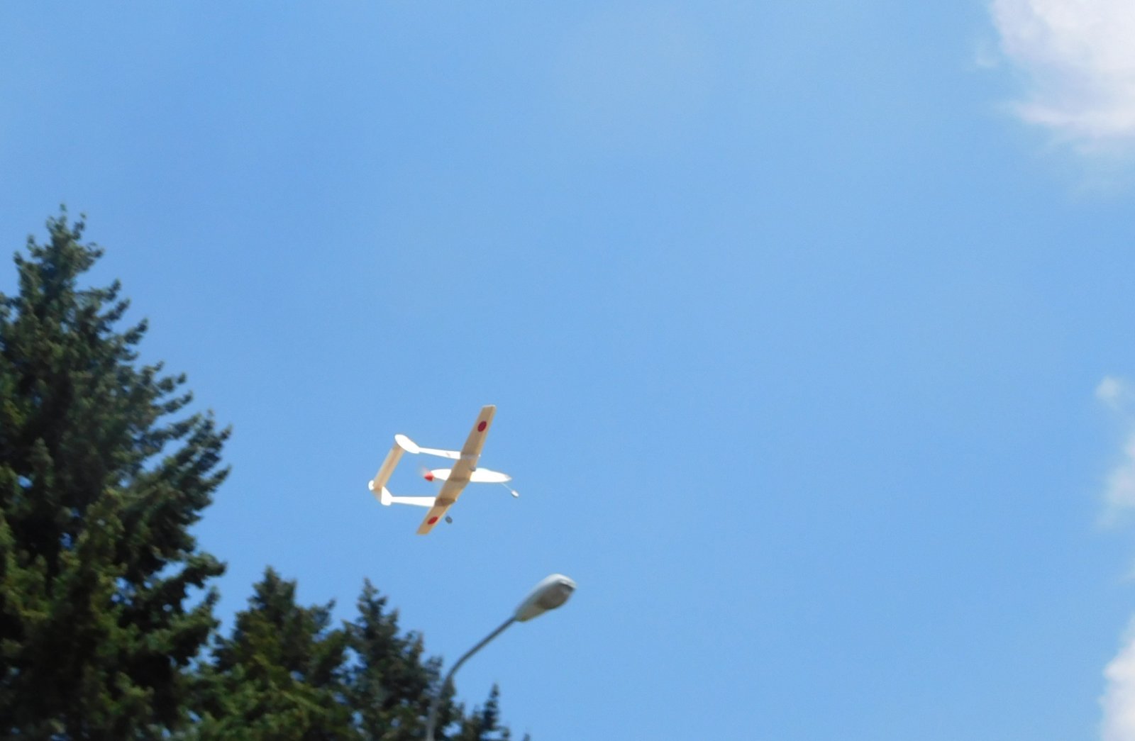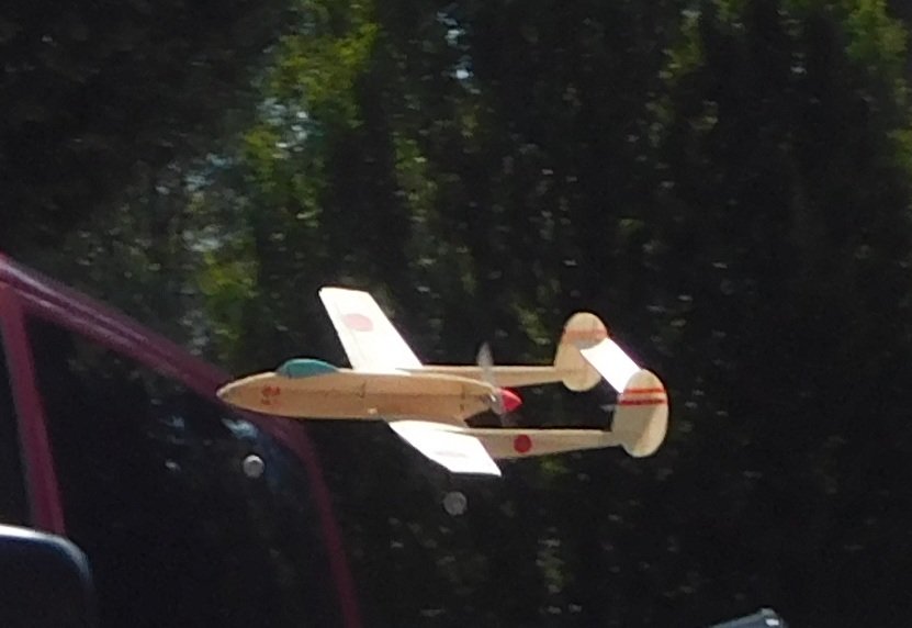 Provedl jsem tedy G.O. toho stíňáku japonské dvoumotorové tandemové kachny. Dopředu jsem dal malý vrtulový komplet IKARA 110 mm, dozadu udělal balzovou vrtuli o průměru 90 mm a staré olétané svazky z Ki-98 smyčky z gumy 1,85 g/m. První lety začínaly prudkým stoupáním a pak rychlým přechodem do klesavé spirály na jednu, nebo druhou stranu. Pak jsem zúžil listy na vrtuli IKARA, zalomil kachní plochu do V a začal nové zalétávání. Následovalo velmi příjemné překvapení. Nyní již model začal létat naprosto stabilně, na 550 otáček start s prudkým stoupáním do výšky asi 12 m, tam zhoupnutí a znovu nastoupání nad kandelábry, tam klidný let v horizontu a po skončení motoru velmi pomalý kluz.