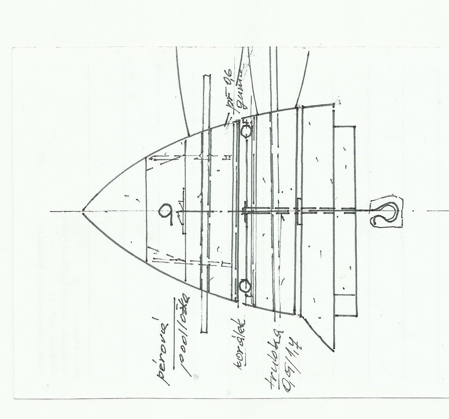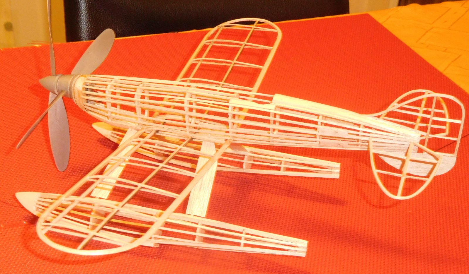 Stavba oříška začala již před tím prostudováním podkladů, ty se v některých detailech jednotlivých letounů i tvůrců výkresů v různé literatuře lišily (především šlo o tvar SOP a VOP). To, co považuji za nejvěrnější přikládám jako nový podklad. Stavba kostry byla bezproblémová. Problémem však byl potah, po zkušenostech s plyspanem u M.67 a problémy s vypínáním potahu na křídlech, kdy v inkoustové tiskárně žlutý papír potištěný byl nepodajný a choval se jako plechový a venku ve vlhu se přes několikeré lakování hnusně krabatí, jsem se rozhodl použít tenký modelspan. Program rolety pro tisk, který jsem dostal od Standy Černého jsem chtěl upravit tak, aby čáry byly dále od sebe a tisk byl méně tučný. Přestože je ten program v excelu tak se mi to nepovedlo a nedařilo se to ani vnučce Marušce. V JASYKU mi vše vyřešila ochotná pracovnice na jejím PC programem v Coralu, jenže tím můj PC vybavený není, takže ona mi to přeposlala v JPG a ještě i vytiskla na bílý papír. Doma nastal problém : méně tučné černé, či spíše šedivé tony moje tiskárna HP 205 tvoří z barevné cartriže a ta moje je zaschlá a tiskárna to odmítala tisknout. Náhradním řešením bylo dát ten potisk na bílém papíře do tiskárny a jen kopírovat na žlutý modelspan. Povedlo se i když tisk je trošku tmavší, než jsem si představoval. Potahování červeným modelspanen a žlutým s povrchovým chlazením, které je mnoha místech bylo složité a zjišťuji, že po tisku v inkoustovce e i starý dobrý modelspan stává dost plechovým a pak se špatně vypíná. Proto doporučuji křídlo a kormidla potáhnout nejtenším kondenzátorákem, stříkat humbrolkami, agamou, nebo rebelkami a povrchové chlazení řešit buď stříkáním přes šablonu, nebo obtisky, ono to také vyjde lehčí. Příjemným překvapením pak bylo, že zcela hotový oříšek beze svazků váží jen 11g. Kompletace a zhotovení výpletu bylo díky přípravku – montážnímu truhlíku snadné. Horší je, že takto prázdný oříšek má těžiště v 12% hloubky křídla, je tedy po čertech těžký na nos. Ani po dovářením v těžišti svazků 3g se toto neposunulo tam, kam patří, po vyřešil až modelářský špendlík zabodnutý do konce SOP. Takže letová by mohla být asi 15g.
