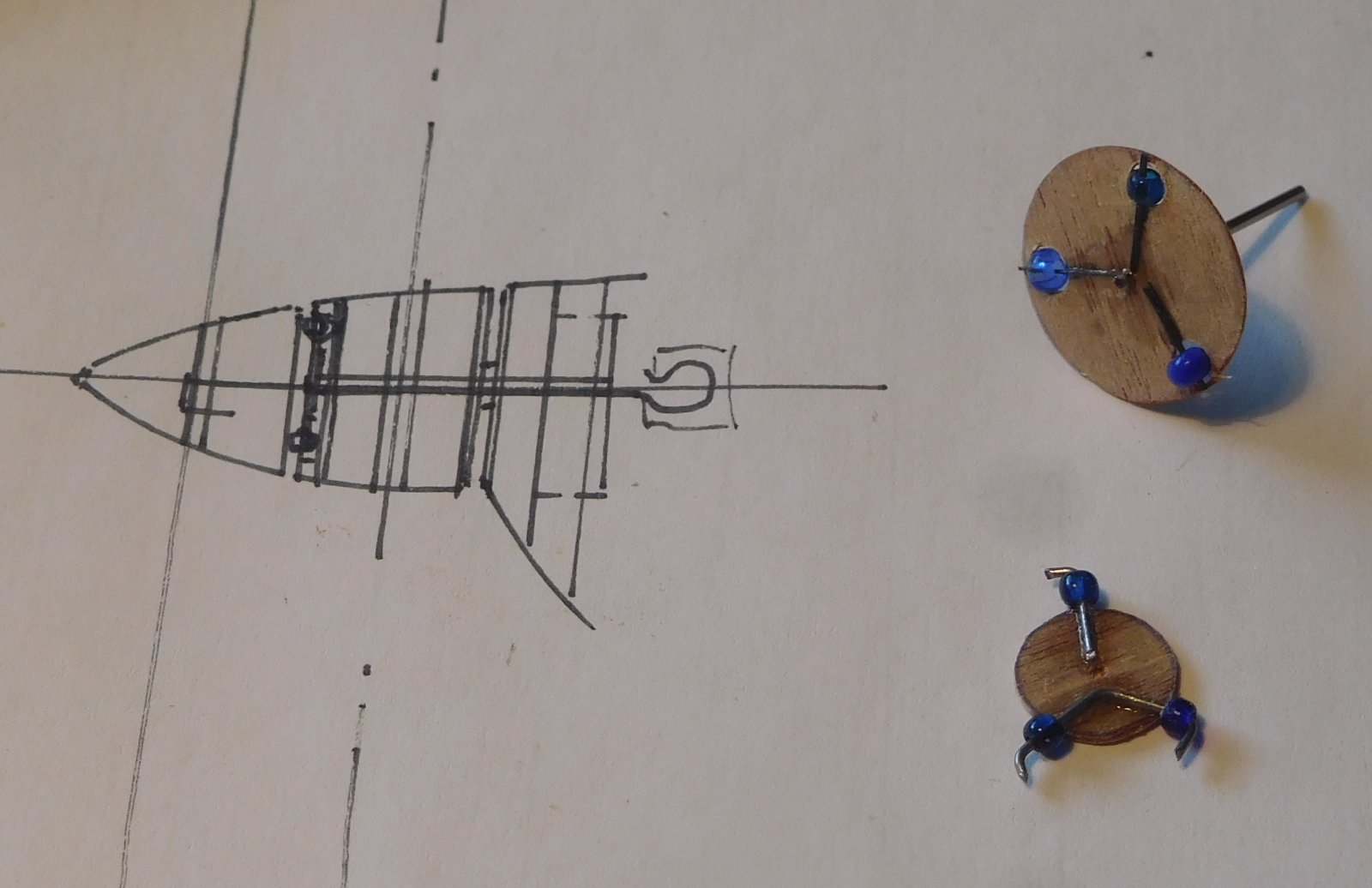 Tak jsem zkusil udělat detail toho ptřecího převodu se třemi skleněnými korálky. První pokus, kdy na malém překližkovém kroužku jsou nalepeny 3 ocelové dráty 0,5 mm , na nich ony korálky a proti vypadnutí jsou konce těch drátů zahnuté se moc nepovedl. Takže druhé řešení: v dělící rovině kruhový terč o průměru 15 mm, v ose zalepená injekční jehla, v ní bude osa z ocelového drátu 5 mm pro přední vrtuli, po 120° na okrajích terče z překližky 0,6 mm vyvrtané kruhové otvory 2,5mm a v nich kulové korálky o průměru 2mm, navlečené na oskách z uhlíku, které jsou uprostře nalepené na tom terču. Více asi ukáže fotka. Pokud budu pokračovat, pak asi místo zajištění tření korálků s čely obou vrtulí napjatým kondomem, polepím ta čela velmi jemným smirkovým papírem. Uvidíme zda to tak bude fungovat. Samozřejmě, že hodinář by vše řešil profesionálně, místo korálků by tam byly maličké ozubené pastorky a ty běhaly mezi oubeným mezikružím na obou čelech vrtule.