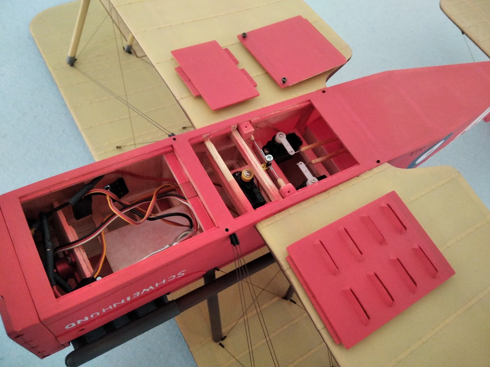 Jinak jsem tedy upravil uložení serva křidélek a tím pádem i přístup k vybavení - vše spodem. Vrchní část následně zalepím, až budu mít hotovou motorovou přepážku. Dvířka k servům jsou připevněny vruty, dvířka k baterii, přijímači, motoru a regulátoru pak na magnet.