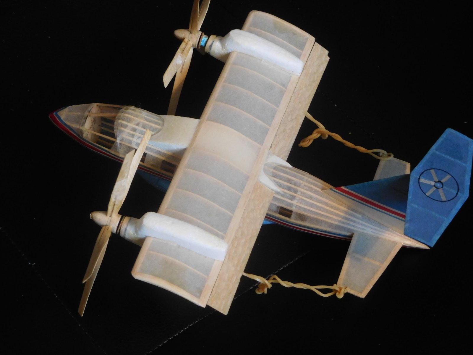 Koncem šedesátých let byly v odborných leteckých časopisech popsány dvě verze japonského dopravního letounu s vertikálním startem a přistáním.Tehdy jsem nejprve měl jen to málo, co bylo otištěno v L+K, ale byl tam 3 pohled i barevné schema. Napřed chtěl jsem si postavit pistácio tohoto letounu s funkčním překlápěním křídla, což jsem nejprve zkoušel na stínové polomaketě. Zjistil jsem však, že nejsem hodinář, abych to zvládl do funkční dokonalosti při tak malých rozměrech. Přechod z visení do normálního letu nebyl spolehlivě zvládnutý a protože pistácio již bylo značně rozestavěné, tak jsem se spokojil s tím, že křídlo bude trvale v poloze pro horizontální let. Takže vlastně jen dvoumotorák s poměrně velkými pětilistými vrtulemi. I tak bylo zalétávání dost náročné a při létání vždy bylo třeba zkušeného pomocníka, kterého dělal syn Petr. Nakonec se podařilo tento zajímavý model vyladit na nejlepší soutěžní let v Prostějovské hale 51 sec. Nyní po třiceti letech jsem v jedné krabici tento model objevil i s původními svazky, jenže nebyl po ruce onen zkušený pomocník. Natáčení modelu zaseknutého mezi prkénky lavičky na mém plácku to byl horor, nakonec jsem natočil sotva třetinu z onoho maxima uvedeného na sáčku s gumičkami. Let tomu pak odpovídal, pomalý v horizontu sotva 10 s. Inu chce to své, bez dobrého pomocníka nelze žádné zázraky očekávat. Ale možná, že se najde expert, který to dotáhne k dokonalosti i s tím vertikálním startem, překlopením a horizontálním letem. Tento typ by si to zasloužil!