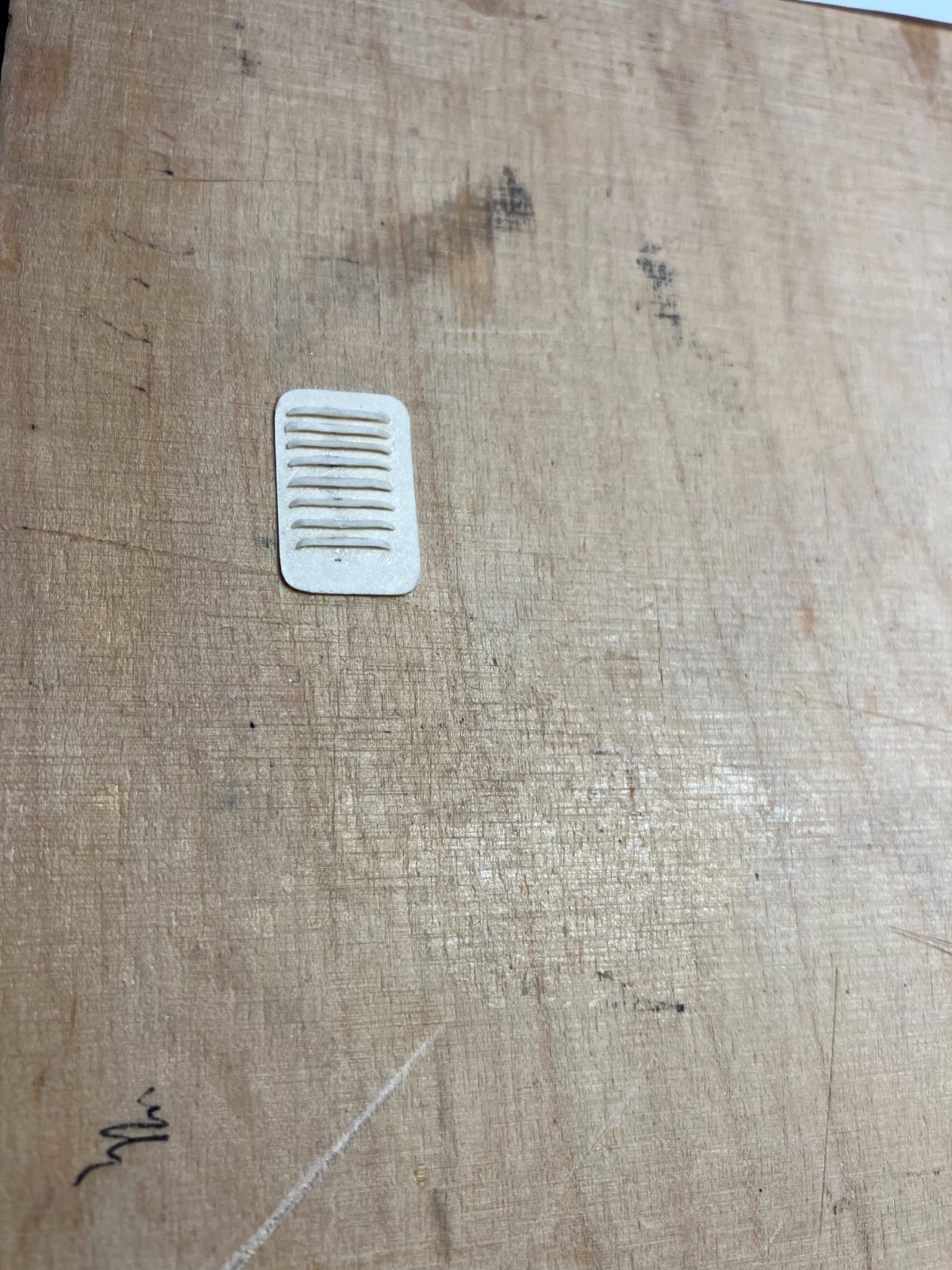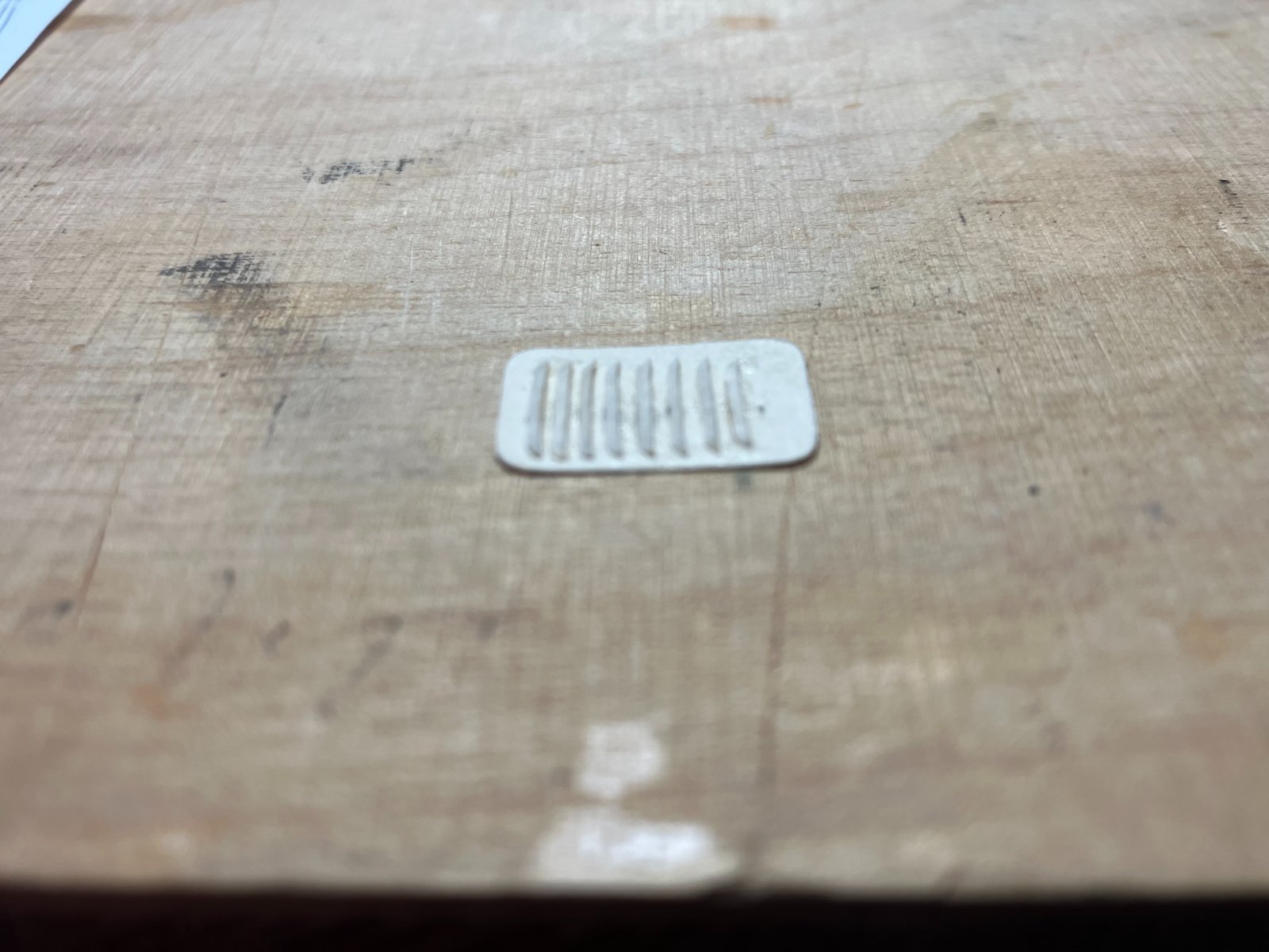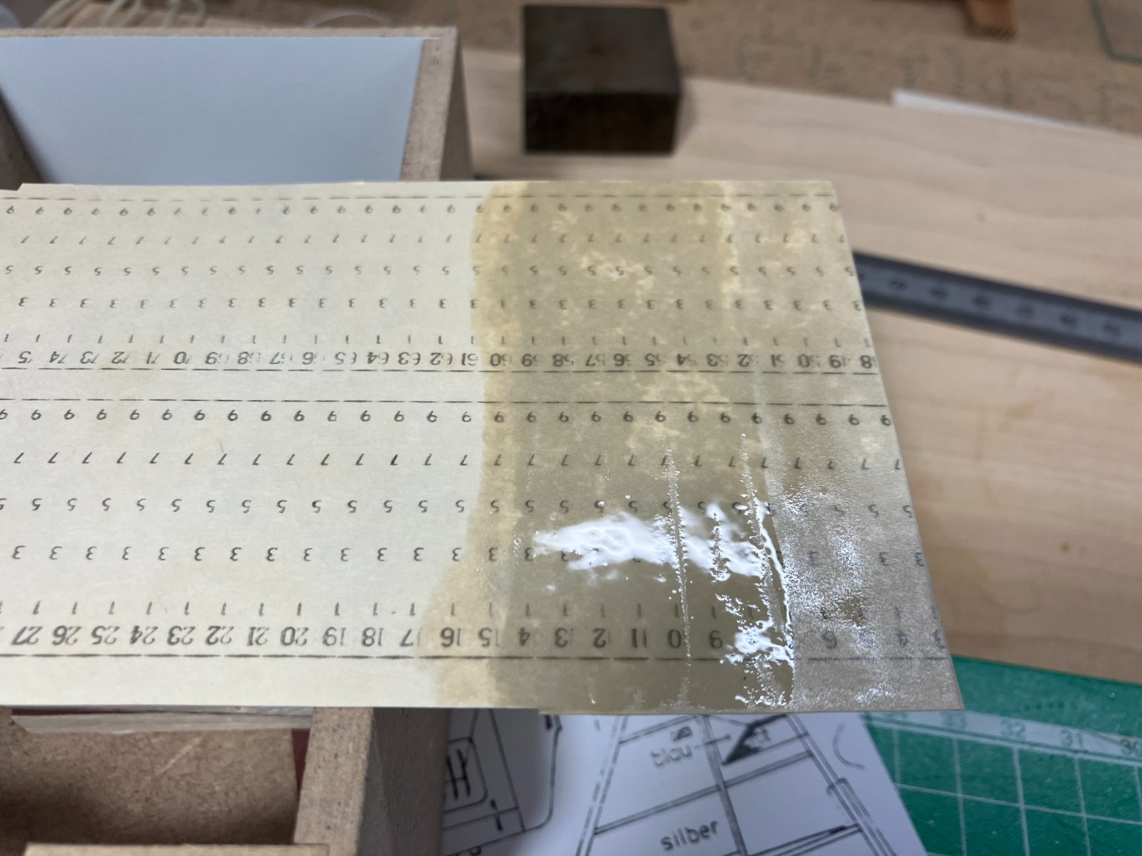 Štítek prolakován, obroušen, uříznut na šíři lamely, zkrácen na délku lamely, pod lupou dotvarován, přes přípravek ohnut a následně pod lupou nalepen na místo.