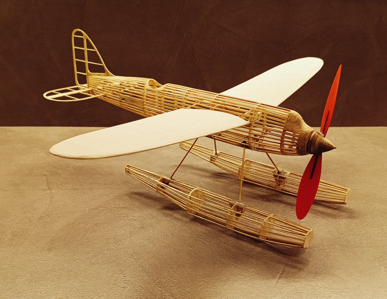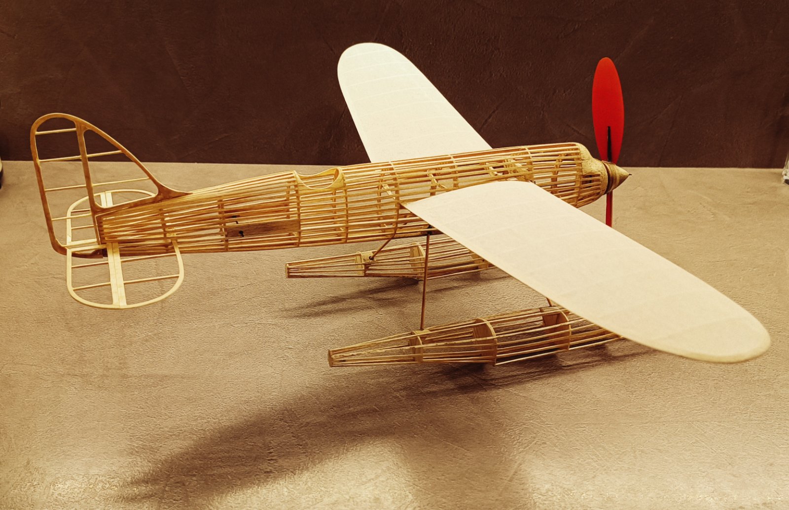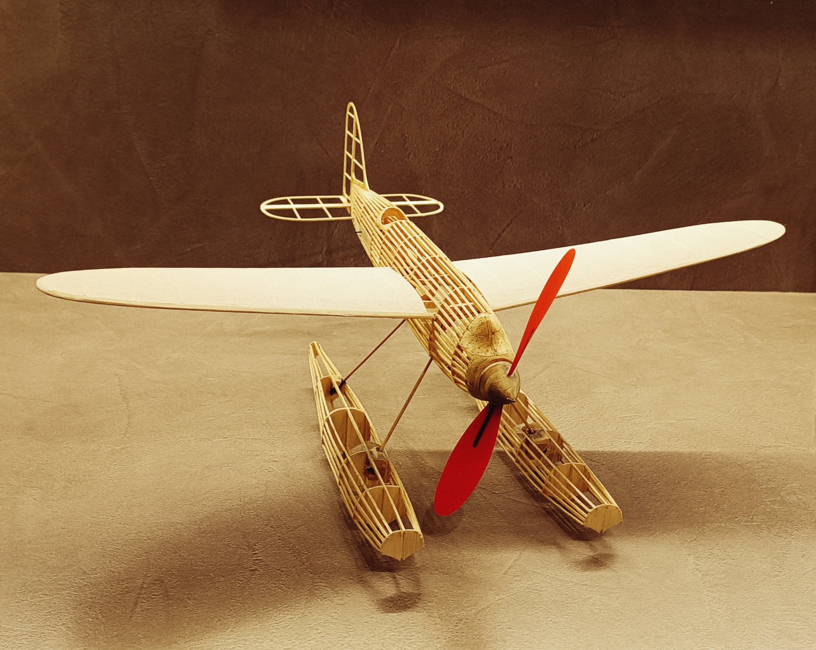Stavba je trochu náročnější než u běžné dvacetinky stíhačky z druhé větové války a předpokládá se, že tento typ bude stavět modelář, který již má jisté zkušenosti se stavbou minimaket. Proto místo podrobného popisu stavby jen zdůrazňuji důležité body a případná rizika. Velice pečlivě vybíráme materiál, moje dvacetinka byla stavěna z velmi lehké, ale dost křehké balzy, což se v provozu projevovalo při tvrdých přistáních praskáním skořepiny trupu v místě vzpěr plováků. Tuto chybu nyní odstraníme kotvením vzpěr pomocí bambusových kolíků do papírových trubiček lepených do pevných bodů kostry. Křídlo má pásková žebra, dva nosníky z pevné balzy a koncové oblouky zhotovené lamelováním na šabloně. Trup je stavěn z přepážek, čtyřech osových podélníků a pomocných podélníků, které jsou na přídi doplněny pásky z lehké balzy 5x1mm zbroušené a lepené tak, aby vytvořily pevnou skořepinu. Kormidla jsou lepena ve špendlíkové šabloně a mírně zabroušena do profilu. Plováky se staví podobně jako trup. Vzpěry jsou z pevné, ale lehké balzy a jsou do nich zalepeny bambusové kolíky, které pak při kompletaci se zasunou do příslušných papírových trubiček v trupu a plovácích. Správné úhly zalepení těchto trubiček je třeba velmi pečlivě provést ještě při sestavení celé dvacetinky v kostře. Pečlivě kontrolujeme celkovou geometrii (rovnoběžnost plováků s trupem, jejich správnou polohu ve všech osách atd.). Trubičky lepíme kanagonem, abychom v případě nutnosti mohli spoj naleptat nitroředidlem a nastavení jejich úhlů dodatečně upravit. Vrtule i s hlavicí mohou být lehké, na listy není třeba volit žádnou tvrdou a pevnou balzu, ta je chráněna plováky do jejich špic se zalepí dovážení 1 g olova. Potah mé dvacetinky byl z bílého lesklého japanu lepeného na kostru ředěným herkulesem, což umožňovalo snadné provedení i na složitých krytech motoru. Potah byl vypínán vodou (vlhká vata), pak 2x silně ředěným napínacím lakem, potom stříkaný bílou humbrolkou a na konec opatřený obtisky, orýsovaný a přestříknutý ředěným zaponem. Motor byl u mé dvacetinky tvořen smyčkou z gumy TAN SS 5x1 mm o délce asi 600 mm, mazanou ricínovým olejem.