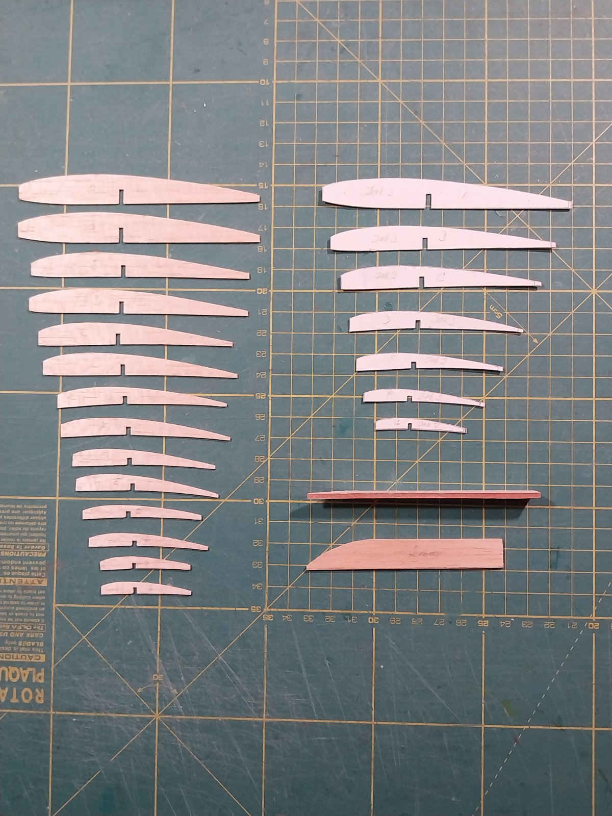 Zhotovení žeber na křídlo. Žebra zkopírovaná na kopírce z plánku na etiketovací papír (prodává se ve velikosti A4), po vytištění nalepení hrubě vyříznutý tvar žeber na tvrdší papír a následné vyříznutí přesných žeber včetně zářezu pro nosník křídla. Podle takto přesných šablon z tvrdého papíru vyříznutá jednotlivá žebra včetně vypilování zářezu pro nosník křídla. Pro zhotovení zářezu pro nosník křídla jsem použil "udělátko" podle Toma Halmana z jeho vebových stránek maxfliart. Na tvrdou balzu o tlouštce nosníku nalepený vteřiňákem proužek brusného papíru. Velmi se mi osvědčilo.