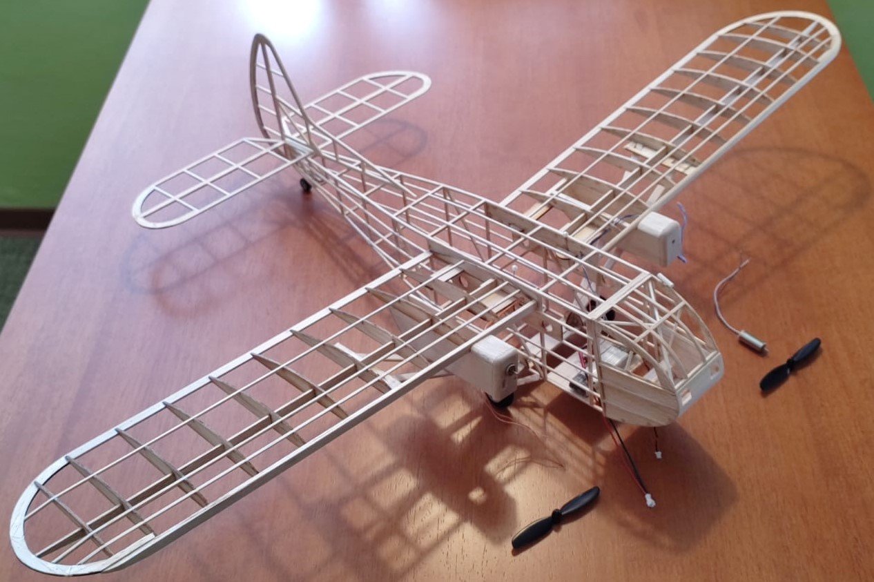 Model je potažen a nabarven. Motorky ještě nejsou zapojené. Povrchová úprava je fádní a v trávě se bude blbě hledat.