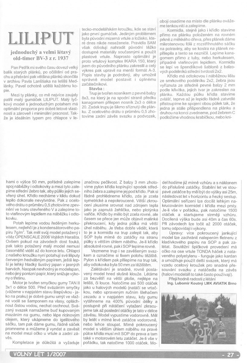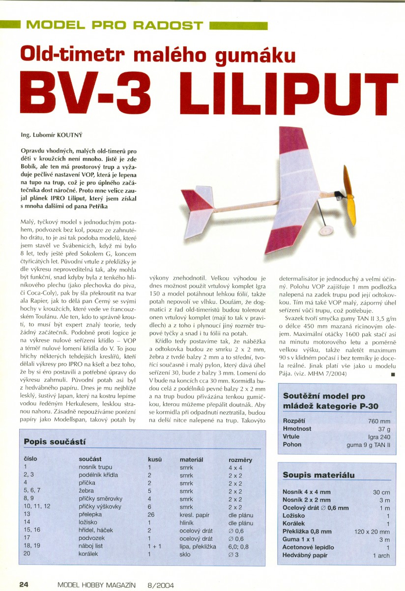 Dá sa o všeličom polemizovať. Chápem snahu Ing. Koutného o návrh malého gumáčka pre dnešnú nešikovnú mládež. To je v poriadku, ale NIE, NIE, NIE pre napísanie "Old-timer LILIPUT dnes BV-3" nad rozpisku, kde dole je napísané MODELÁŘSKÝ SKLAD J: VYSKOČIL .... A nie, nie to znovu zopakovať aj v časopise, určenom pre modelársku verejnosť v rubrike MODEL PRE RADOSŤ. NIE!!! To nie je Old-timer, ani BV-3. To je len model pre radosť!