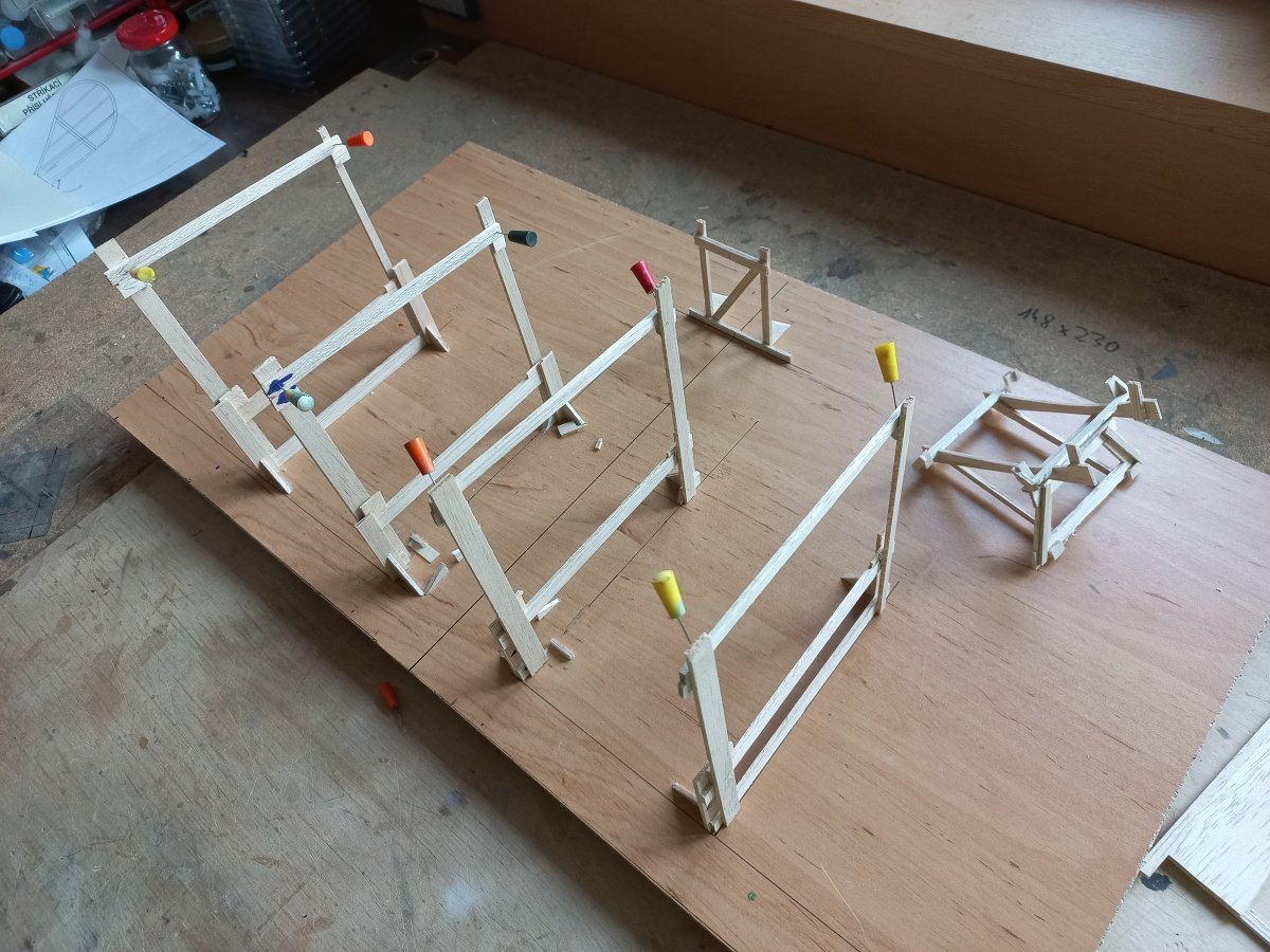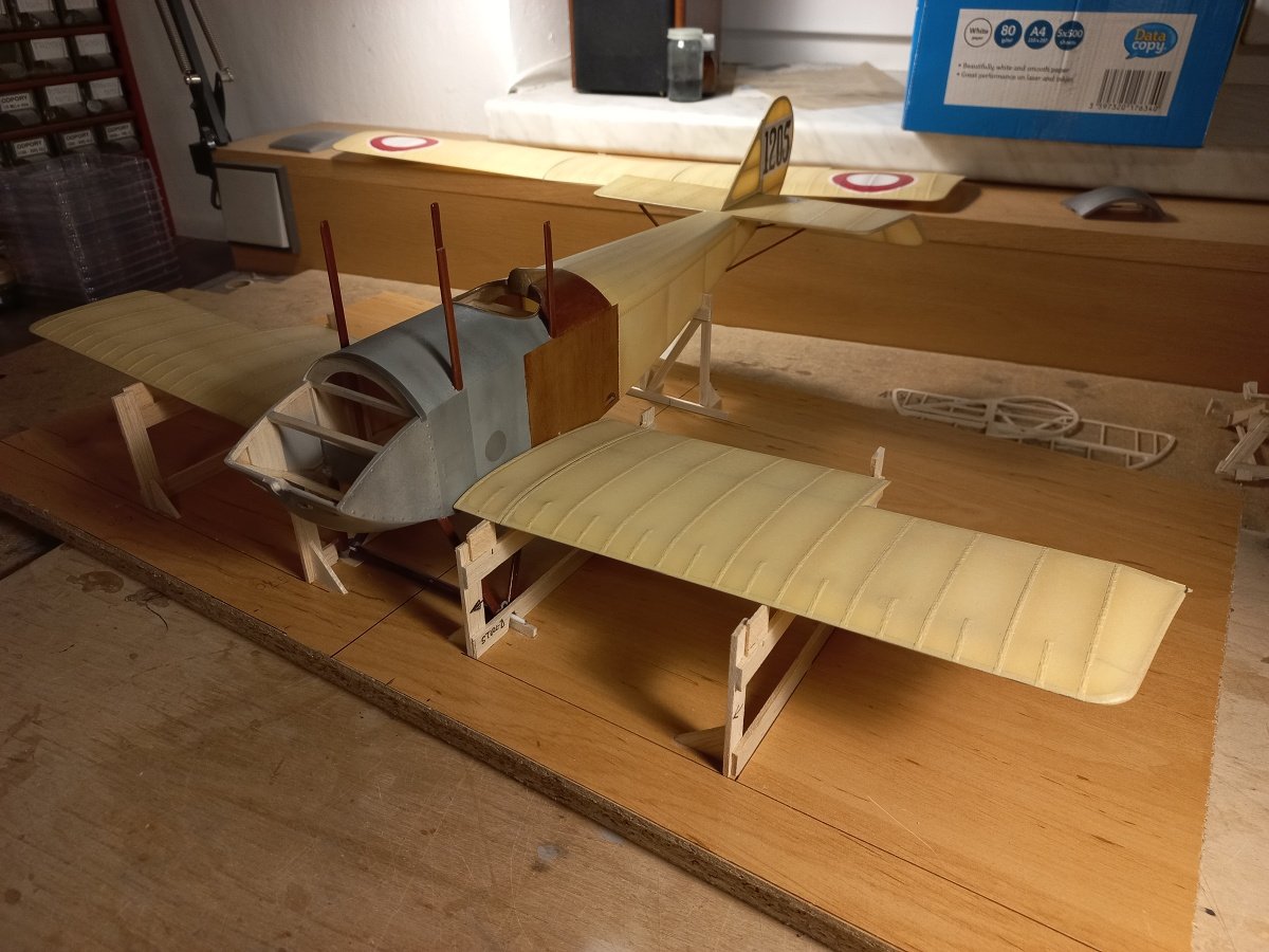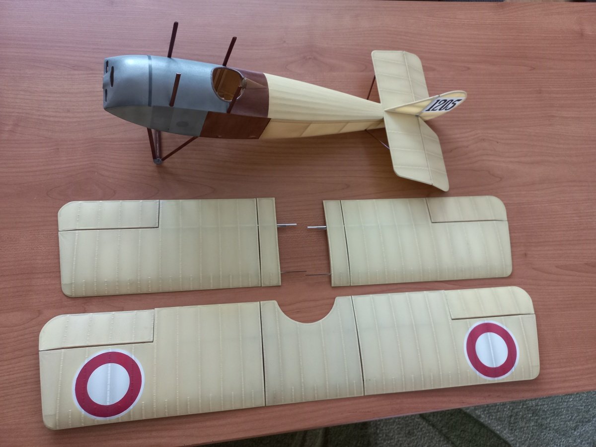 Takže jsem vyrobil přípravek na ustavení dolních křídel vůči trupu a následně jej rozšířil i na ustavení křídel horních. Když vše drží jak má, přípravek se rozláme aby z něj šlo model dostat ven.