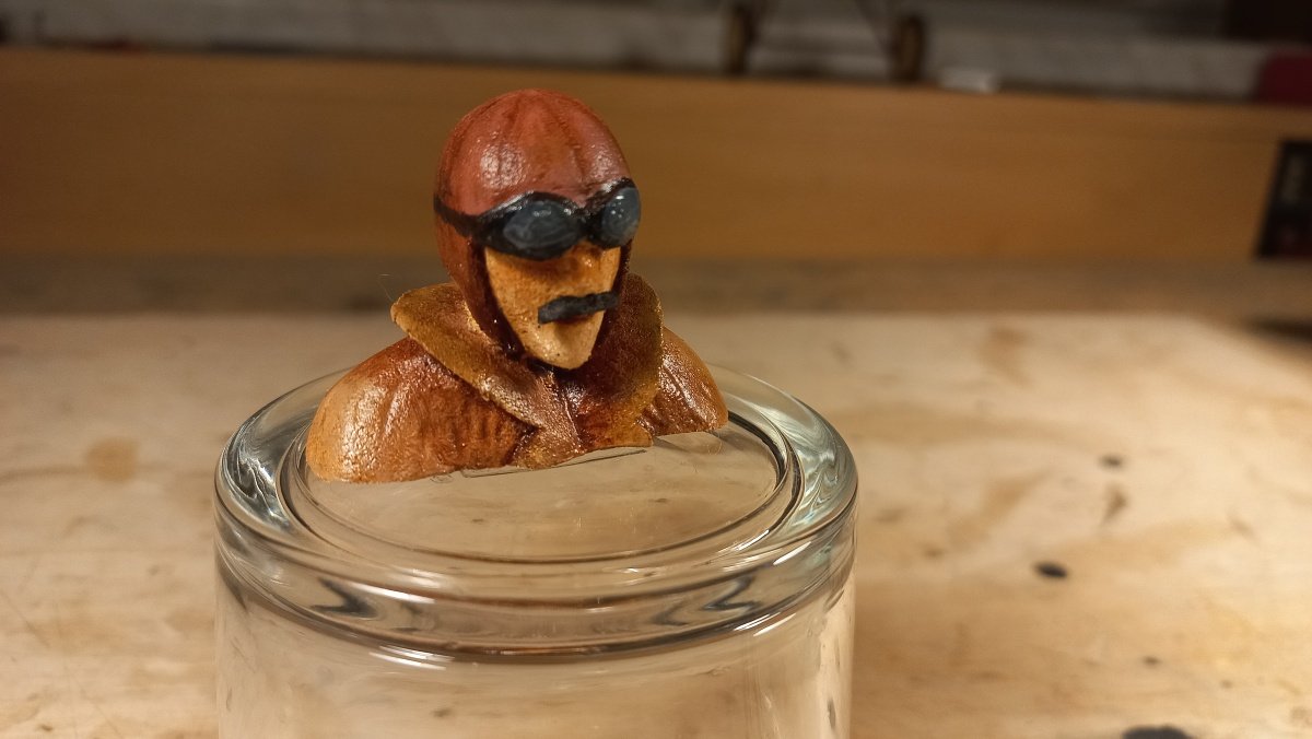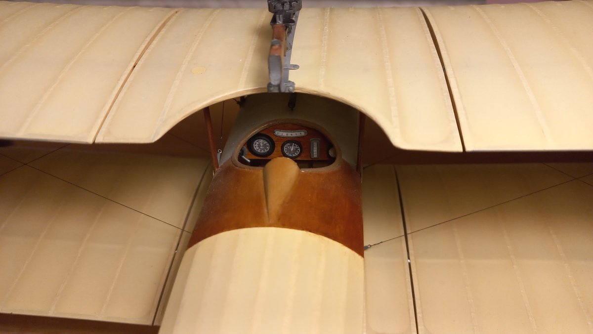 Protože patinu moc neumím, tak jsem moc neexperimentoval a udělal ji stříkáním tak jak jsem to nakoukal na Youtube a načetl na kitařských fórech. To se mi zdálo celkem zvládnutelné a myslím že jsem se toho jakš takš zhostil. Plátěné plochy bylo potřeba trochu maskovat Tamyia paskou, plechy na trupu byly snazší. Dřevěný povrch trupu je nastříkaný na světle hnědo a pak houbičkou a štětcem roztíranou olejovou barvou. Trochu otravné je, že se musí dělat každý plát překližky samostatně, aby se od sebe odlišily a nevypadalo to hračkovitě, jenže se mezitím musí počkat než olejovka na sousedním panelu zaschne a to opravdu dlouho trvá, v řádu dní. Tady těch plátů je naštěstí minimum.