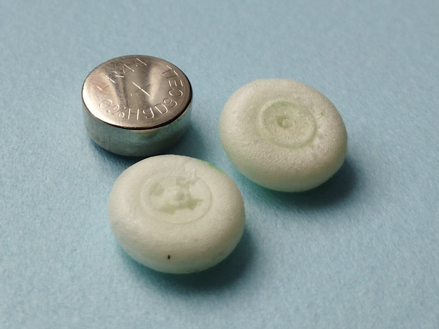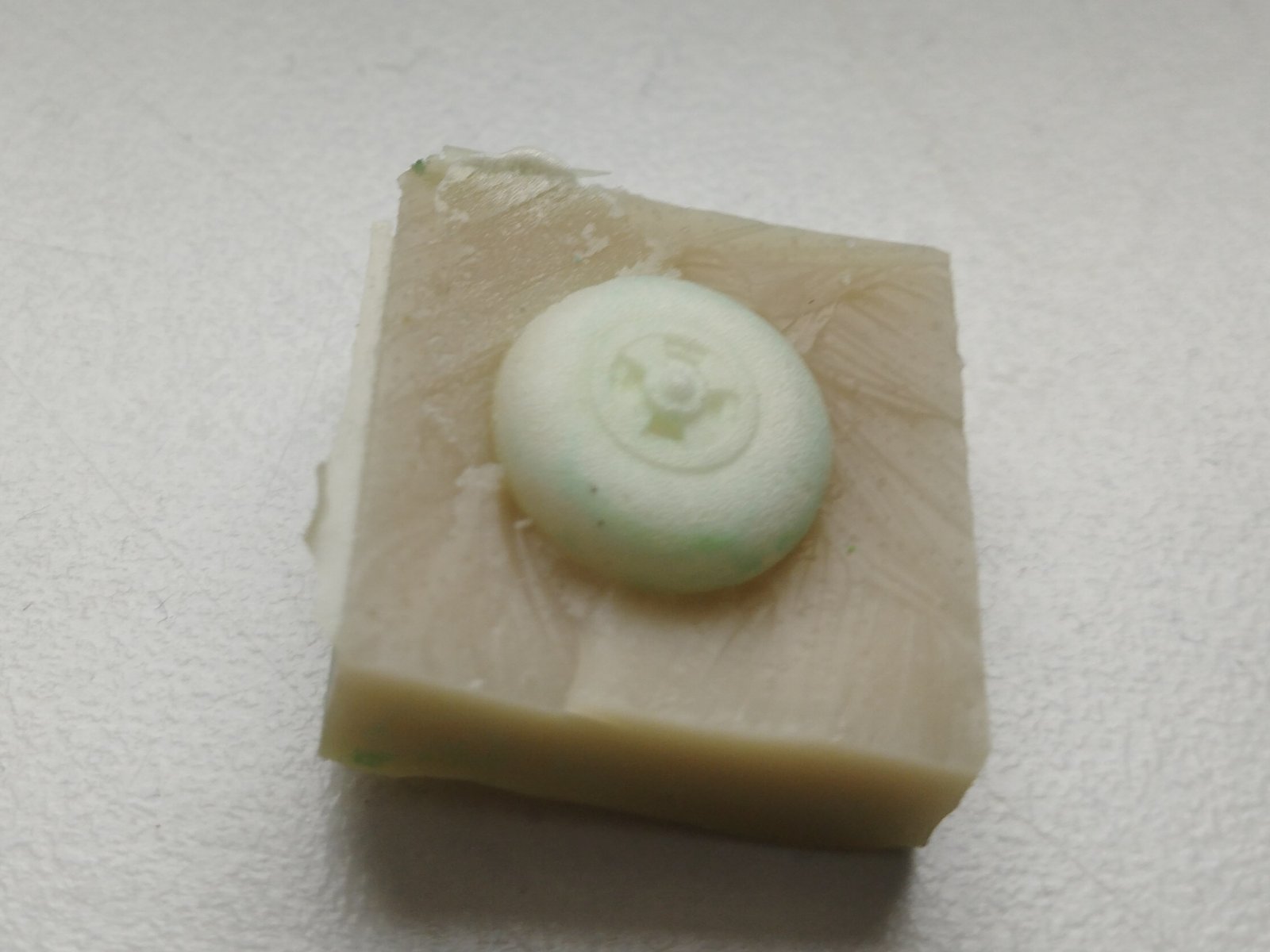 První pokus proběhl s aplikací pěny do injekční stříkačky a přes růžovou jehlu do formy. Slepá ulička. Pěna expanduje ihned za ventilem, takže po výstřiku ze stříkačky se dále moc neroztahovala. Je to prostě duchařina, protože dovnitř nevidíte a čekáte co z toho bude. Výsledkem byla první zničená formička, forma se naplnila asi z 60%. Druhou formu jsem zabil vstříknutím pěny přímo ze spreje přes kónickou trubičku jejíž průměr na výstupu byl shodný s průměrem vtoku na formě – zkrátka nasazená plastová pipeta na ventilu pěny. Naplnění formy na 100%, ale velké bubliny na díle = malý tlak. Toto mne nasměrovalo k samotné pěně. Odlil jsem další formičky a druhý den koupil klasickou montážní pěnu stejného výrobce. Po zavadnutí pěny jsem formu v pomyslné dělící rozříznul a ejhle. Sláva! Pro ty, kdo by chtěli něco podobného zkoušet, mám radu nad zlato: pořádně si zajistěte pipetu/trubičku na dávkovacím ventilu, nedělejte to v obýváku jako já a chraňte si oči. Neřízený rozstřik pěny je v takovém případě v rámci několika metrů.
