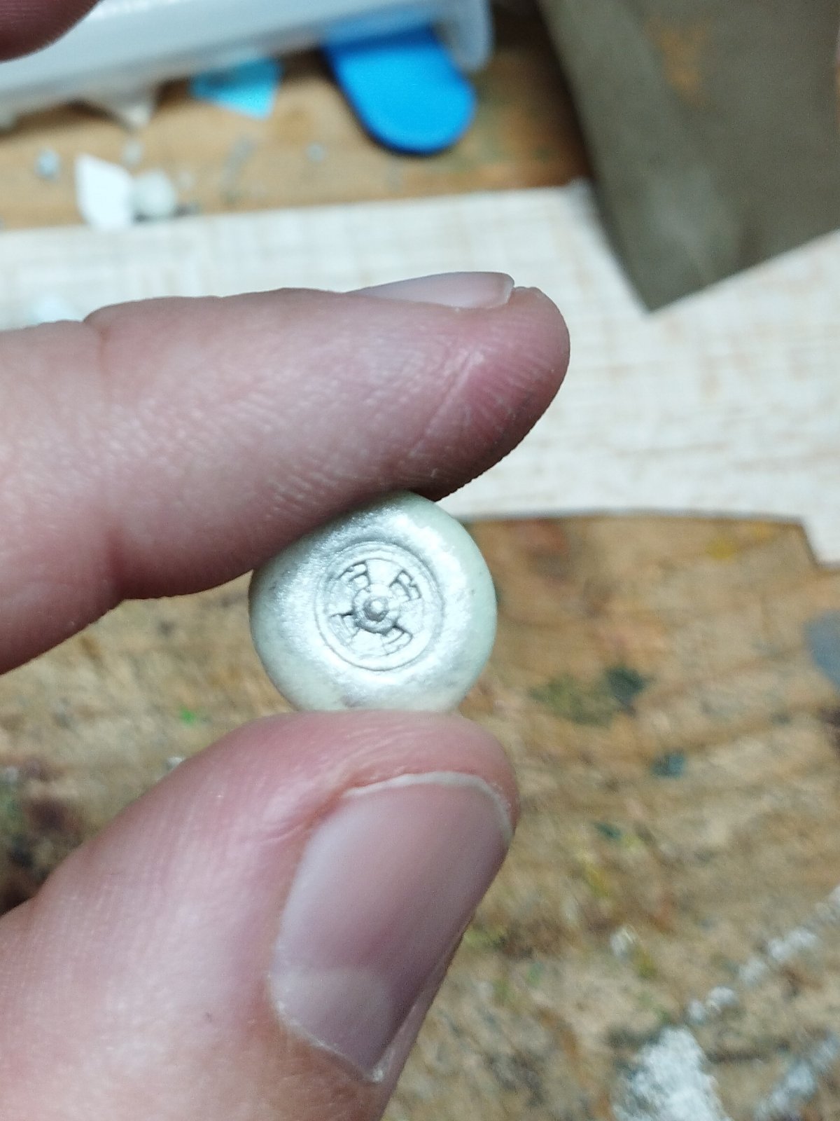 Co mne láká dlouhodobě, je um jistého minimaketáře z Prahy, který z montážní pěny do forem stříká neskutečně detailní a ultralehké figurky pilotů. Než se za dvacet let ty figurky naučím, začal jsem jednodušeji – koly. Kola jsou párový orgán, takže skoro už sériová výroba, což si zaslouží formu. Jelikož kola má Spit ve stavebnici moc pěkná, využil jsem je jako mastery, které jsem zaformoval do gumy. Předem uvedu, že sondovat, jakou chemii a technologické postupy Michal Křepelka používá je zbytečné, byť to z části vím, beru to jako jeho know-how a toto plně respektuji. Takže jsem se vydal cestou (několika) slepých uliček. Náhodou se mi pod ruku dostala tekutá PU dvousložková guma VytaFlex o finální tvrdosti 50 Sh, takže se šlo na věc. Do os kol jsem zalepil 1,5 mm plastové hřídelky, které slouží jako nálitek, správně vlastně vstřikovací kanál, našel krabičku ne větší než jsou kola, nalil do ní směs a kola do ní ponořil a čekal do druhého dne na vytvrzení. Výhoda tohoto materiálu je ta, že nepotřebujete vakuovačku pro odsátí vzduchových bublinek ze směsi, bublinky tam prostě nejsou. Druhý den následovalo odtržení vtokového kanálku – plastové trubičky a naříznutí formy pro vyjmutí kolečka, kterou jsem po té zalepil. Najít pomyslnou dělící rovinu kola šlo prosvícením celkem dobře. Co už tak dobře nešlo, byla práce s pěnou. Naivně jsem si koupil malou nízkoexpanzní od firmy So_dal s aplikátorem, což mi přišlo jako fajn benefit kvůli opakovatelnosti použití v dalších desetiletích.