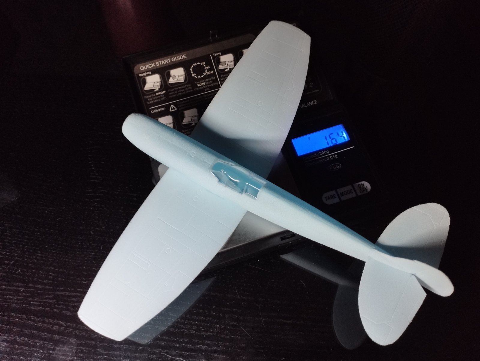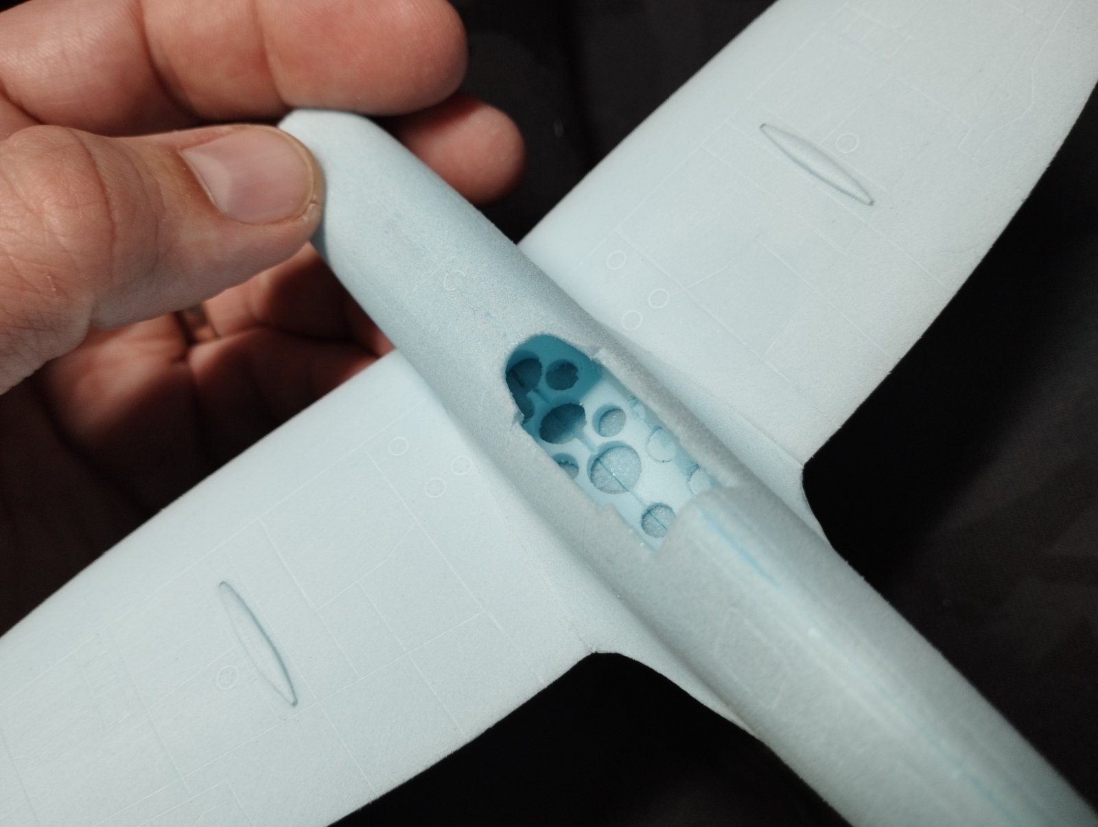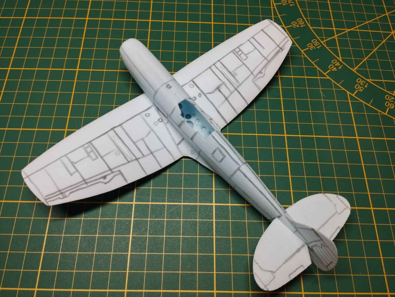 Po těchto drobných detailech přišla na řadu stavba draku. Jako stavební materiál používám modré XPS desky Styrex tloušťky 2 až 15 mm. Křídlo je vyříznuto z 3 mm desky, postupně ale obroušené z horní strany na tloušťku 2,5 mm ve středu, postupně ke koncům křídla na 1 mm tloušťky. Spodní stranu křídla přebrousím jen lehce, jednak aby zmizely drobné stopy od řezání drátem a taky aby deska moc neztratila pevnost, kterou získala spálenou vrstvou po řezu odporovým drátem. Používám brusný papír Globus Made in Czechoslovakia typ 383 z 80tých let minuléto tisíciletí a to tak, že vše je vždy broušeno jedním směrem. Následně křídlo brousím do chtěného profilu s rovnou spodní stranou. V této fázi přichází na řadu rytí paneláže, to oměřuji pomocí papírové šablony výkresu paneláže křídla, kterou postupně stříhám pryč, a tak co udělám vlevo, hned udělám i vpravo. Stejný postup platí samozřejmě i na spodní straně. Paneláž ryju správně zlomenou 0,13 mm žiletkou, stranou, která je ale tupá. Mám s tím lepší zkušenost než např. rytí entomologickým špendlíkem, ten mi občas po polystyrenu poskočil a zanechal za sebou brázdu. Na dlouhé tahy používám pomocné „pravítko“ z měkkého plastu. A jde se do koupelny. Ne že by bylo už tolik hodin, ale profil křídla ohýbám přes hranu vany. Je velmi vhodné si před touto činností ostříhat nehty a sundat z rukou, prstů šperky. Na polystyrenu je totiž ihned vidět sebemenší otlak, mělký jde opravit „rozleštěním“ v ploše. Vytvarování křídla do profilu je otázka cviku, ale stačí několik tahů sem a tam s jemným tlakem středních článků prstů a to především v první třetině hloubky profilu. Křídlo pak v ose rozříznu a do potřebného vzepětí slepím disperzí. Tím je křídlo připraveno na kompletaci s trupem.