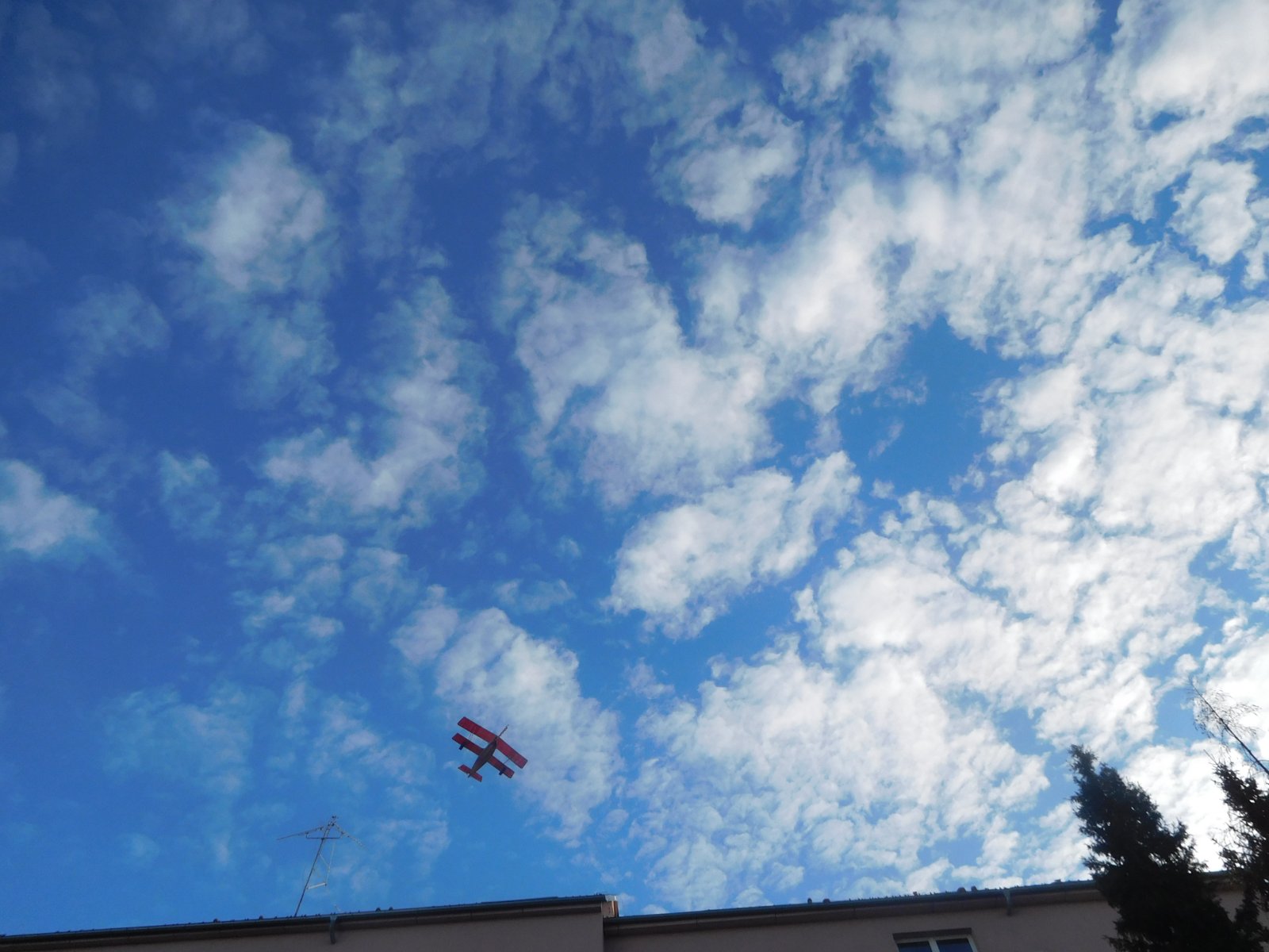 Při focení takovým kompaktem jsou zcela marné záběry oproti čisté obloze protože model o velikosti 0,3m je tak malý, že takový aparát na něj není schopen zaostřít a expozice se buď vůbec nekoná, nebo to cvakne po mnoha vteřinách. Snažím se proto mít v záběru i něco většího, strom, nebo část baráku, na to se zaostří a expozice je v setině sekundy. Při dobrých světelných podmínkách je pak obojí v rozsahu hloubky ostrosti a v počítači lze často výřezem i ten pevný objekt odříznout.