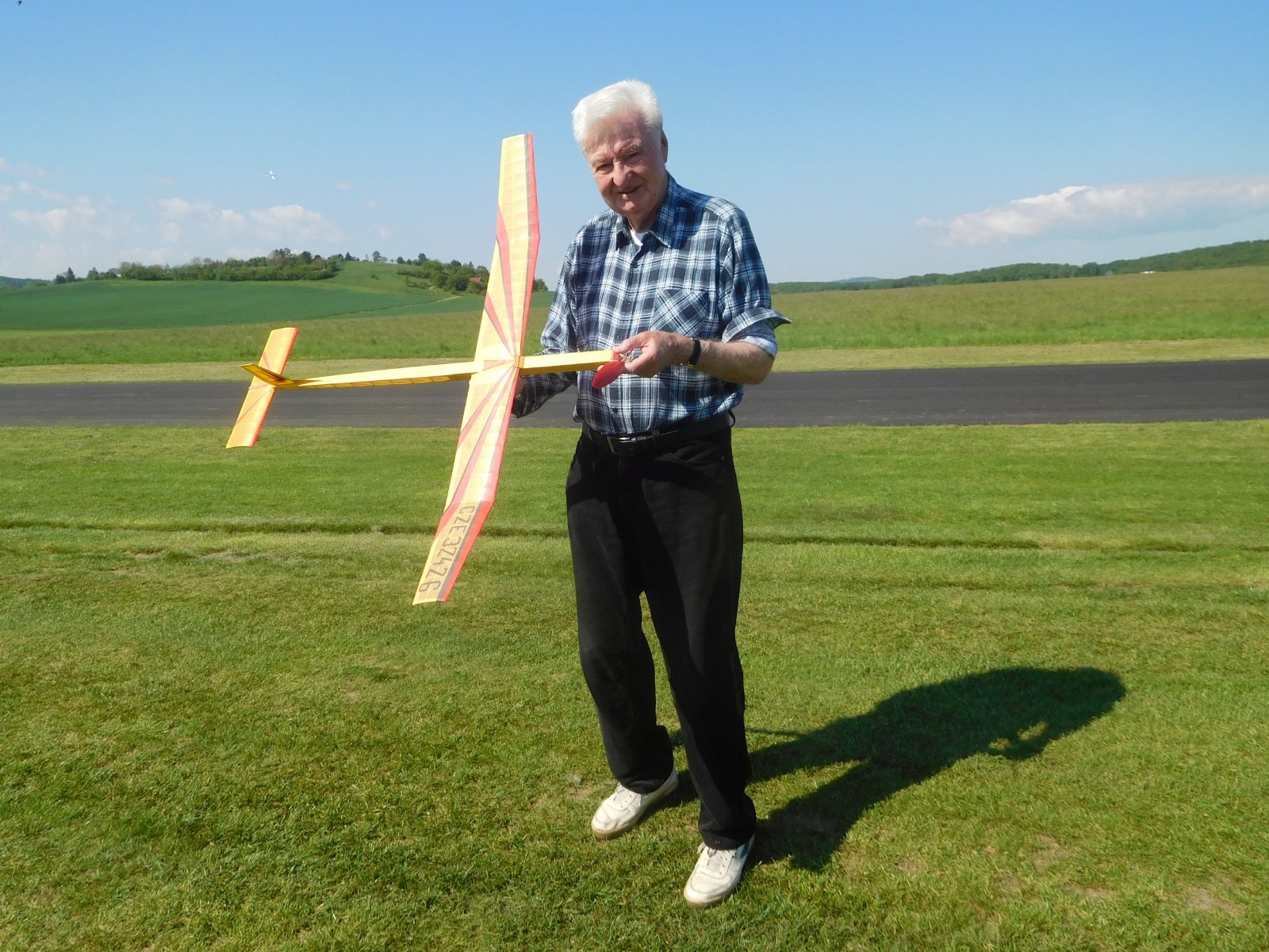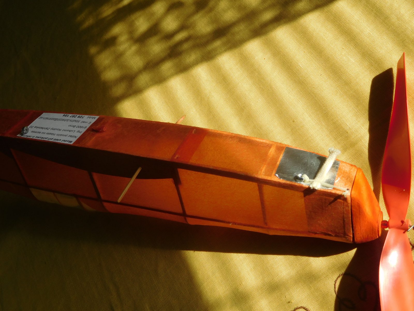 Včera bylo nádherné počasí, ráno jsem si vzal i tenkou bundu (na internetu bylo 12C), ale venku pralo slunko a bunda byla zbytečná, o deváté bylo na Medlánkách bezvětří, které nalákalo spoustu modelářů hlavně s RC modely. Já jsem se usadil u stolku Tondy Pospíchala, který mi mezi starty svých RC dělal pomocníka s mými gumáčly. První pokusy s novým S-101 byly krátké a přízemní, natažení VOP nepomáhalo a tak jsem na směrovku namáčknul 2,5g plasteliny a hned z toho byl úplně jiný model, na 1200 otáček nastoupal 50 m výšky a letěl 80 s. velký aplaus a otázka jaké je pro BV.min maximum no 60s. Na další let točím 1500, tedy 75% z maxima a model nejenže má po minutě přes 60m vžšky, ale již si tam našel pěkný stoupák a přesouvá se směrem k hangárům. Dotazy máš tam deter a adresu? Přiznávám, že ani jedno, naštěstí po konci motoru model začal houpat a sestup byl směrem nazpět, takže jsem se jen trochu proběhl, Tonda říká, dej model do krabice a nelétej s ním dokud nebude mít deter a adresu s číslem tvého mobilu !Stalo se, jen s tím deterem byl problém, který jsem nakonec vyřešil zátěží na silonu přes celý trup přivázaný k SOPa v předu gunička s doutnákem- Pak ještě pár letů s modelem F1G na gumu 5 let starou a šlo se domů, Počasí na kraťasy, a brzy znovu na letiště vyzkoušet jak deter funguje,
