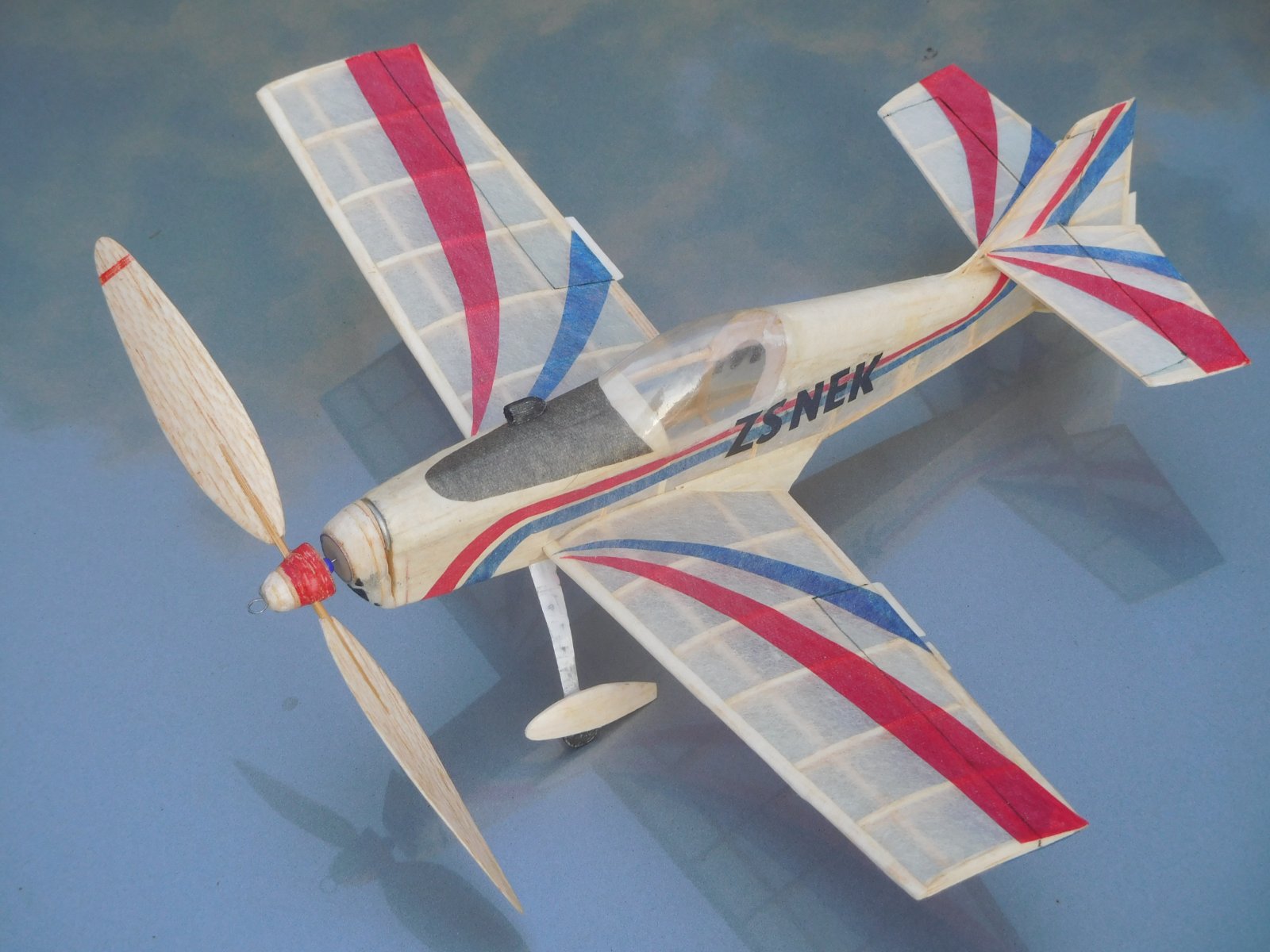 2. Ten druhý OK-TRQ je těžší potažený kondenzátorákem 6g/m2, stříkaný za pomoci kompresoru z ledničky, má větší lomení křídla do V, dělená kormidla a musel být na přídi dovážen 1g Pb. Model je velmi stabilní, létá na gumu TAN SS 2005 smyčku 2.1 g/m o délce 400 mm . v Nizozemské velmi nízké hale, kde byla spodní hrana příhradovky stropu jen ve výšce asi 7m letěl 70sec. což stačilo na třetí místo v mezinárodní Interscale (první byl A. Alfery, takže dva Moraváci na bedně). V Prostějovské hale byl nejlepší výkon asi 95 sec a opět to bylo druhé místo v Interscale. Bohužel snaha o maximální výlony v úzké hale ZŠ Lomnice skončila nárazem do okna a poškozením kormidel, Po opravě jsou již výkony horší.