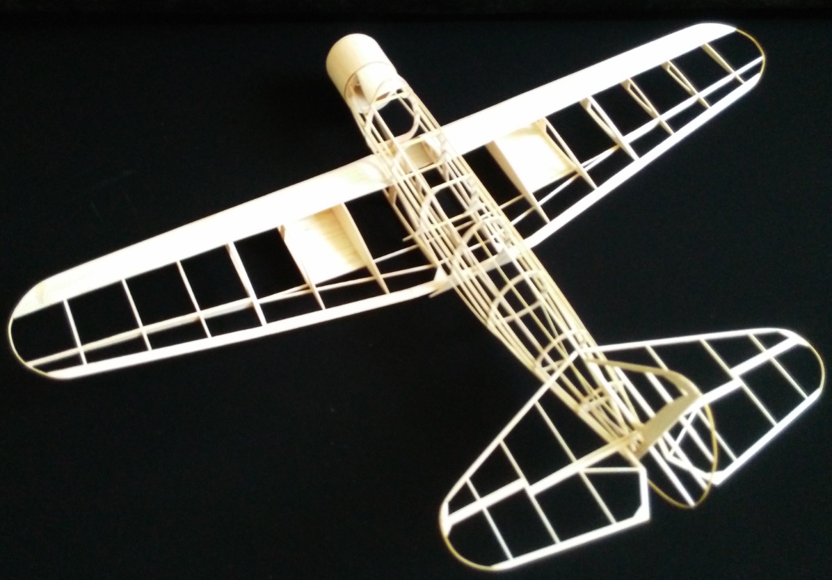Ani v dnešní době by člověk na minimaketářské soutěži nemusel za takový model stydět. Je to celkem macík - 720 mm rozpětí, takže v podstatě dvacetinka. Kamufláž bude samozřejmě tradiční barevná, potah barevným papírem, trup stříkán pomocí fixírky stříbřenkou. Už jen tu ručně vyřezávanou třílistku..