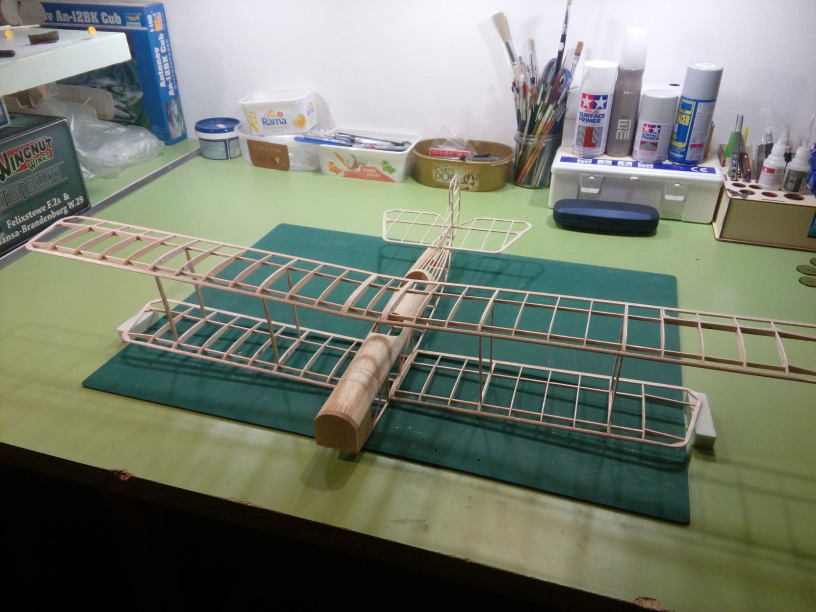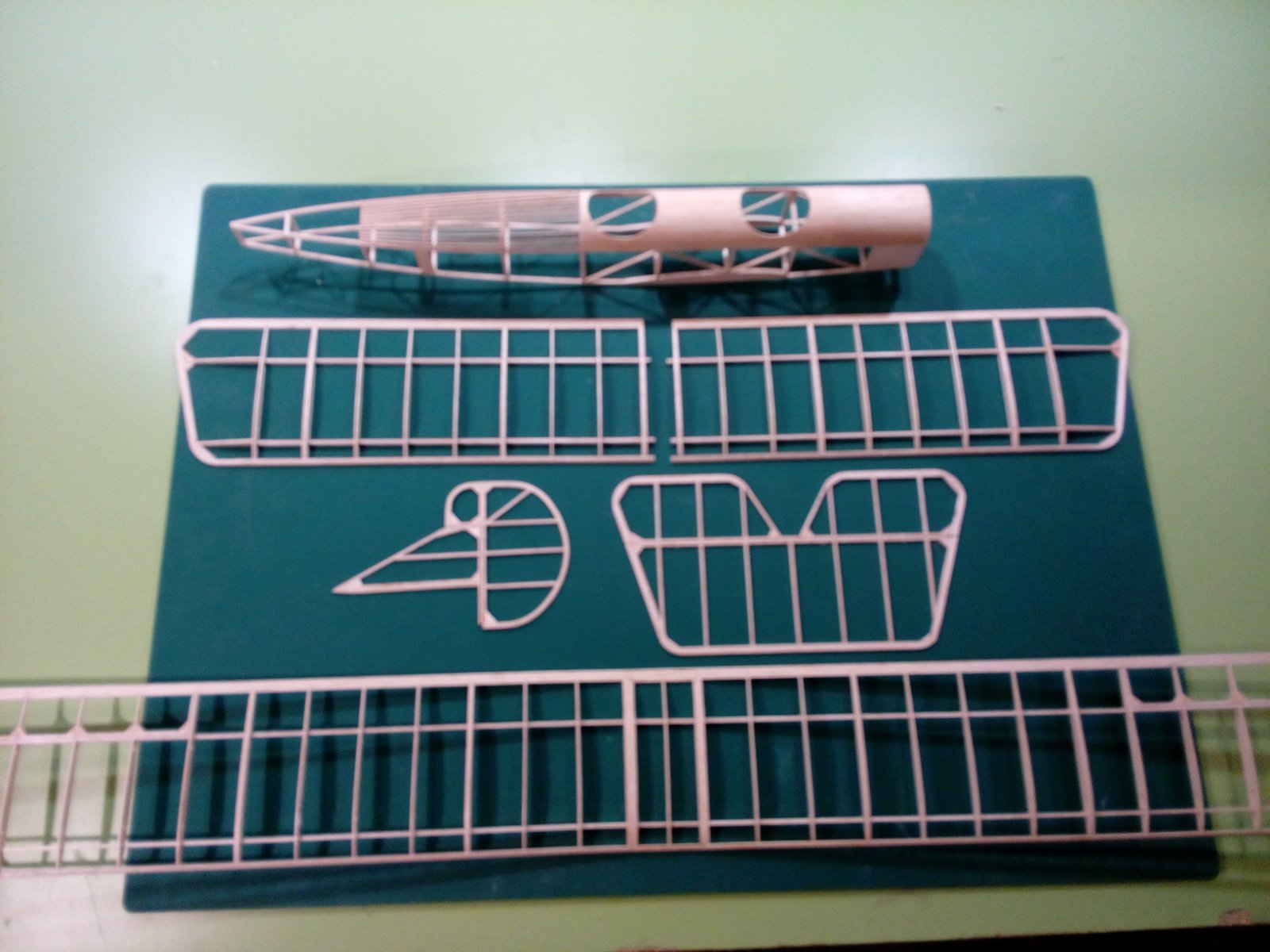 Děkuji za komentáře a začnu postupně odpovídat.Ano na pevnosti mi opravdu záleží,nemám rád když se na modelu konstrukce deformuje vlivem vypínání potahu.Na váhu až tak nestavím stejně to neumím spočítat aby to bylo top.Stavím pocitově a tak jak jsem se to naučil a poučil z chyb. Jak píšeš pár gramů neřeším.Co se týká zesílení míst pro vzpěry dělám to tak vždy,snad jen tady je toho na centroplánu opravdu dost. Prostě chybička ale předělávat to už nebudu,nestojí to za tu práci a hlavně mě to nevadí.Pořádek na pracovním stole je pouze zdánlivý neboť pracuji na velké desce kterou podle potřeby ze stolu sundám se vším co na ní je a uklidím ji z dosahu focení.Jsem typem univerzálního modeláře který postaví skoro cokoli co se mu líbí.Jinak jsem začal potahovat 11g Kashmirem a zatím v pohodé. Za povšimnutí také stojí rozdíl umístění potahu horní části trupu na prvních fotkách a na těch následujících.Při polepování balsou jsem si špatně spočítal přepážky a potáhl to o jednu přepážku dozadu méně.Zjistil jsem to až při zkušebním usazení křídel protože mě nevycházel správně pilotní otvor.Tak šel celej vršek trupu dolů a udělat znovu.Postupně budu přidávat fotky jak to bude přibývat,nenašel jste někdo na netu nějaké zbarvení letounu,já nic nezjistil asi to bude klasika plátno a překližka.
