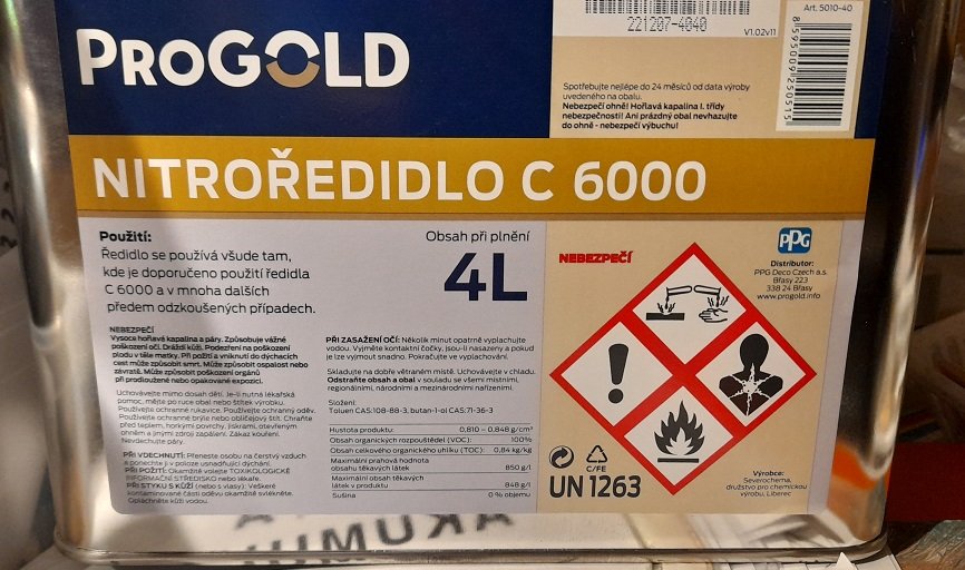 Ředidlo je zcela nové, prošlé fakt není. Všude mi nabízeli Colorlak, někde i Hostivař, ale já chtěl Liberec, právě kvůli zkušenostem z minula. Ono tedy to složení na všech třech je dost odlišné...