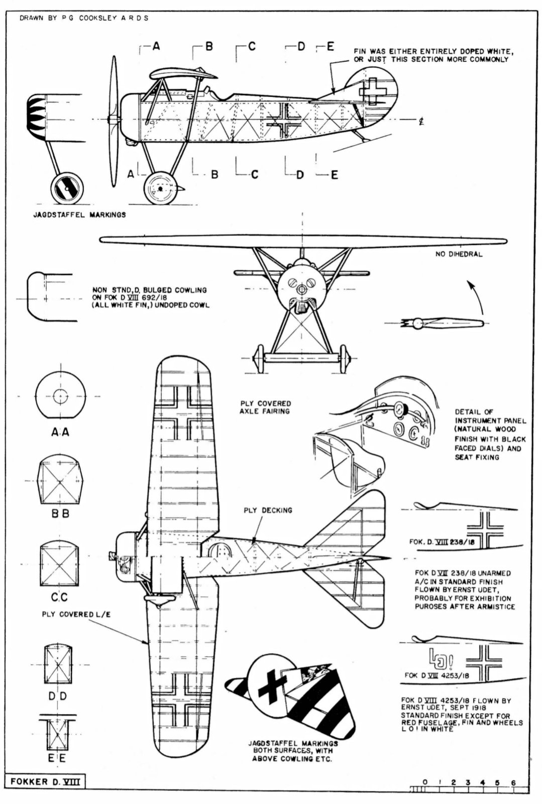 Petře prosím tě můžeš se podívat do té knížky, zda tam je nějaká informace o jeho Fokkeru D-VIII, případně i fotka a prosil bych o oskenování a poslání buď mailem na: koutny.lubomir@seznam cz, nebo přiložit sem, zdá se že téma je zajímavé i pro vice lidí. Já si osobně myslím, že ten popis z r. 1961 je poplatný době vzniku (navíc některé textové poznámky jsou neostré a pro mne nečitelné), z té doby jsou i velké výkresy Fokkera D-VIII s naprosto pravidelnými šestiúhelníky (jaké používali Rakušané, ale nikdy Němci) ve velké a jistě i moc drahé anglické knize, kterou jsme kdysi obdivovali u Honzy Krumbacha a Jirka Boček podle ní měl postavenou svou dvacetinku. Možná je tato publikace v brněnském technickém muzeu Krumbachovy sbírky pod patronací ing. Břínka. Pro mne jsou důležitější fotky než nějaké rekonstrukce různých autorů.