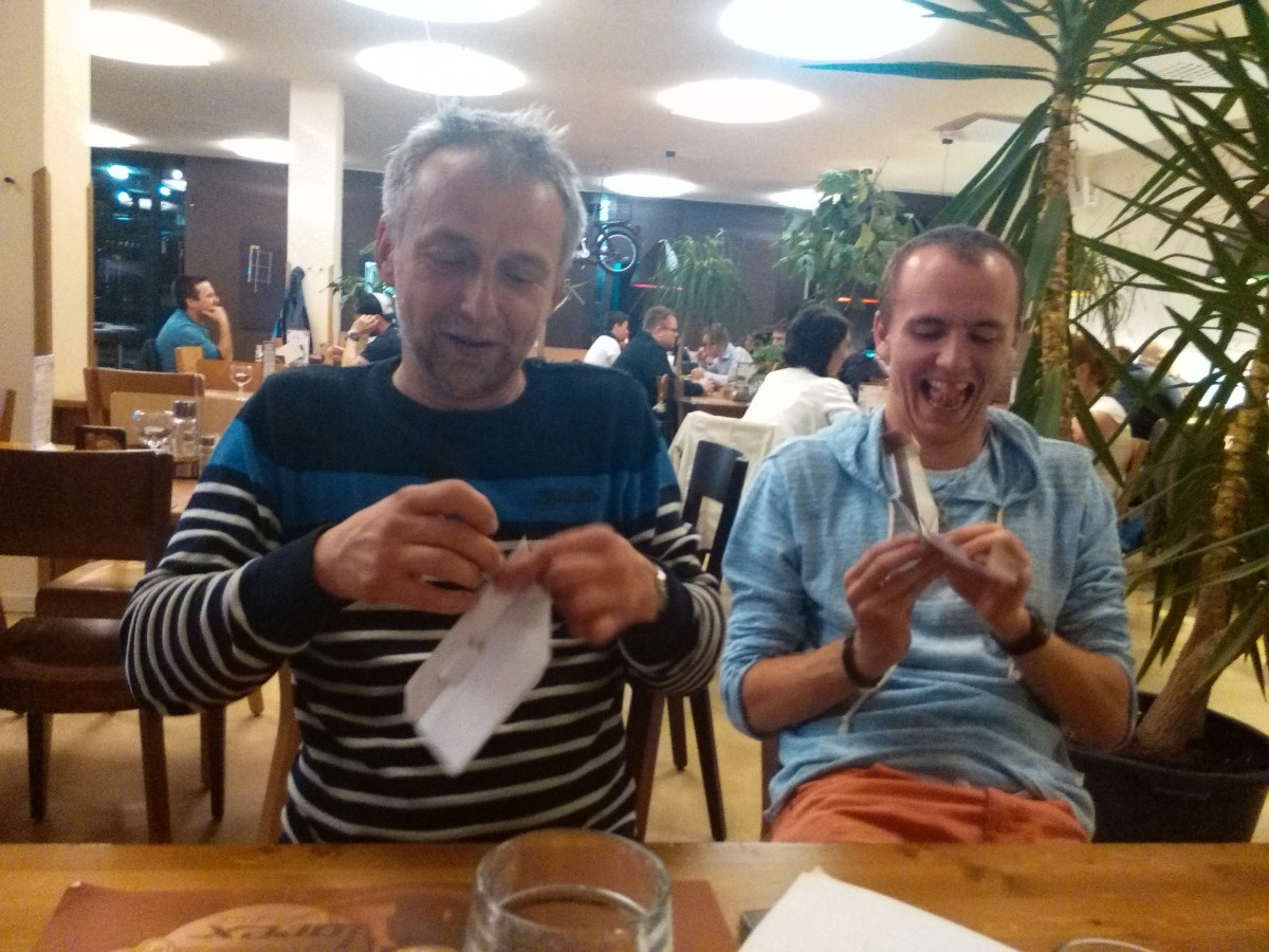 Během večera se z mnohých papírových prostírání staly vlaštovky, jak klasické tak inovativní (Pavel dělal podvozek podle pravidel dvacetinek) , s kterými jsme chtěli po odchodu uspořádat soutěž před restaurací.