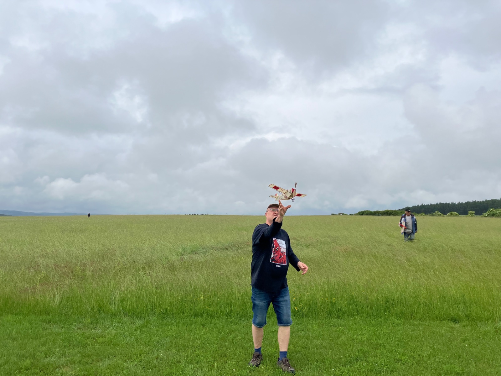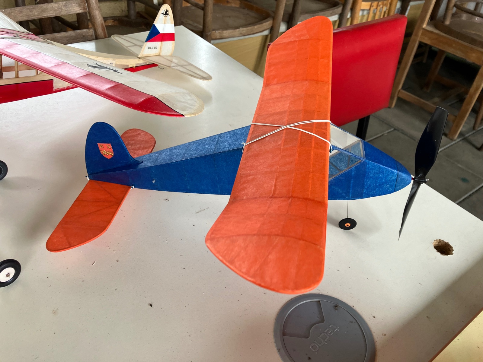 Nejdřív bych chtěl poděkovat všem, co k nám přijeli i přes nepříznivou předpověď počasí. Objevilo se i pár nových tváří (tedy u nás, jinak již modelaří už dlouho). Sešlo se nás deset, dokonce bylo několik "oken" bez deště, kdy jsme mohli létat, čehož všichni využili. Některé starty Michala Křepelky Byla radost sledovat i několik minut. Zaslouženou pozornost budily i RC verze, zvláště RC Marabu, který proti větru dokázal ve vzduchu i stát na místě Modelů bylo vystaveno přes třicet, od klasických gumásků přes RC verze až k vystřelovacím modelům. Bohužel nepřijeli dva známí fotografové, takže atmosféru vystihl na fotkách Jirka Pavlíček. Nejvytíženějším modelářem byl Filip Bílek, který díky hlinkám mohl chodit do neposekané trávy. Meteory díky menší účasti představili čtyři modeláři. Podle úsudku členů našeho klubu byli tři oceněni. Atmosféra byla vynikající, při odjezdu jsem neviděl jediný rozladěný obličej. Všichni zúčastnění přislíbili účast i příště. Jako společný byl vybrán - jak jinak - model z produkce IGRA Plameňák, zmenšený na 50 centimetrů. Jako ukázku jej v růžové barvě představil Michal Křepelka.