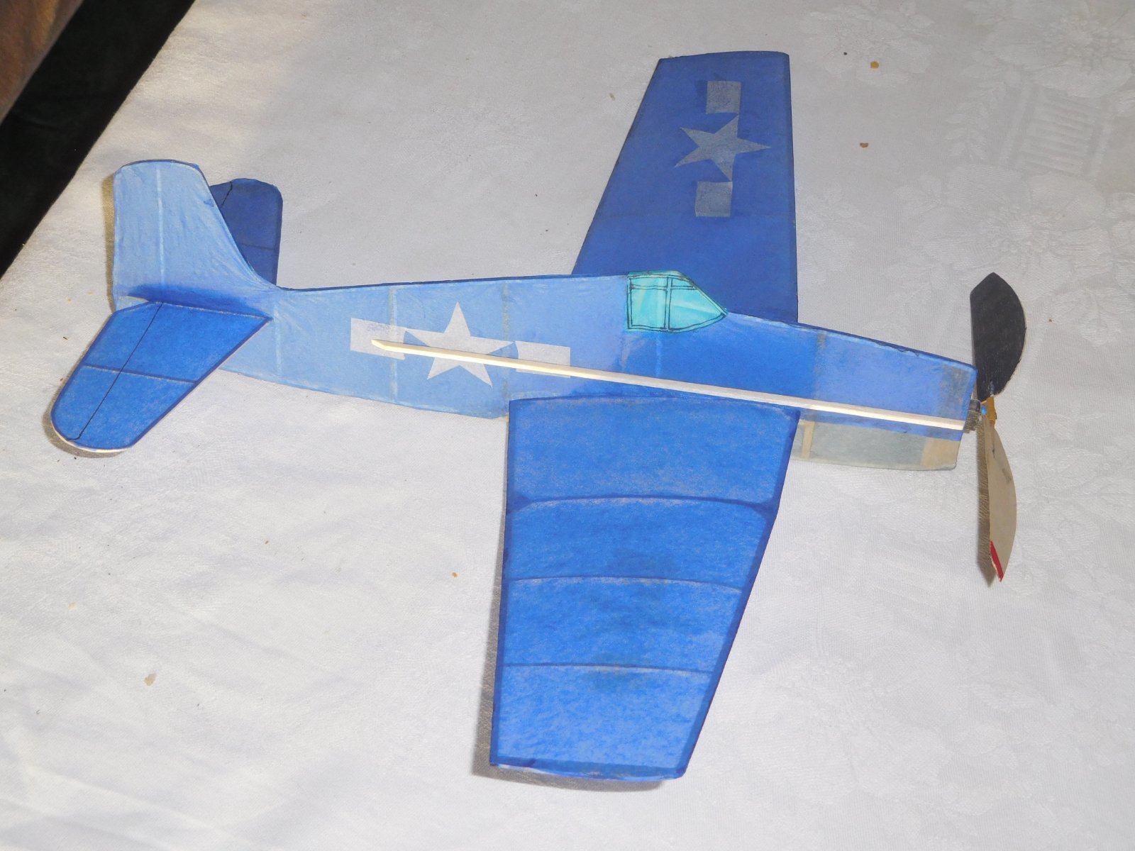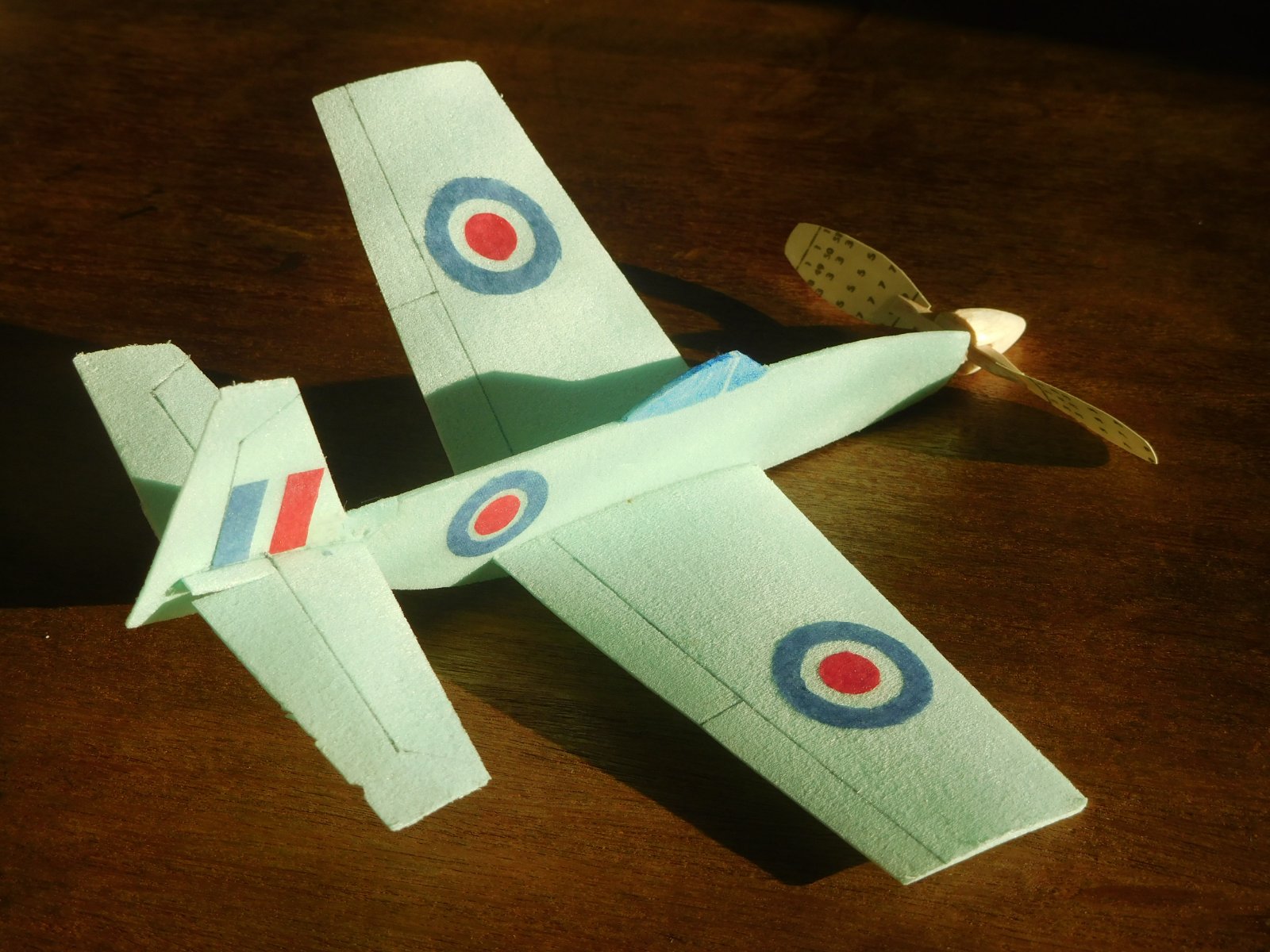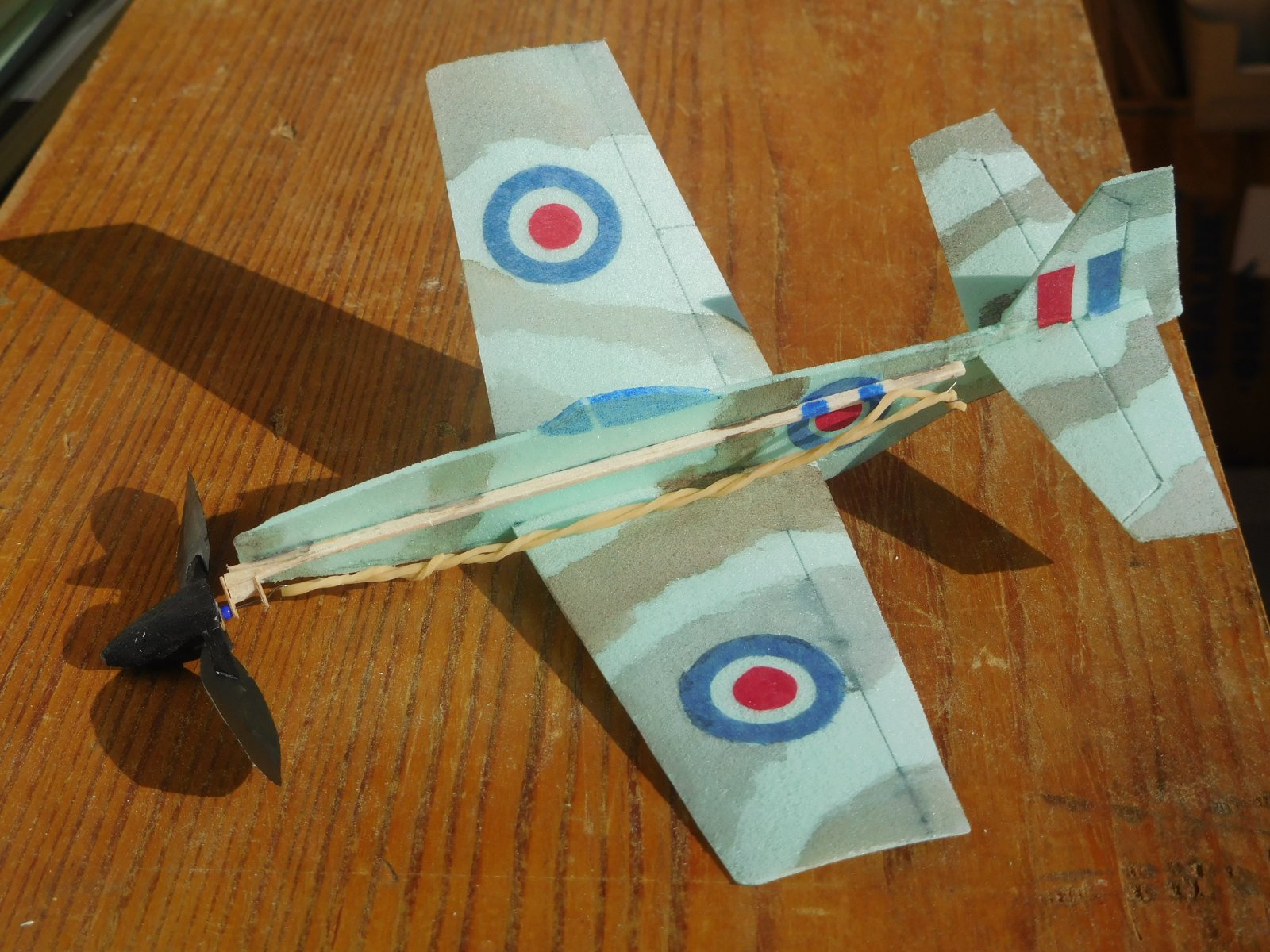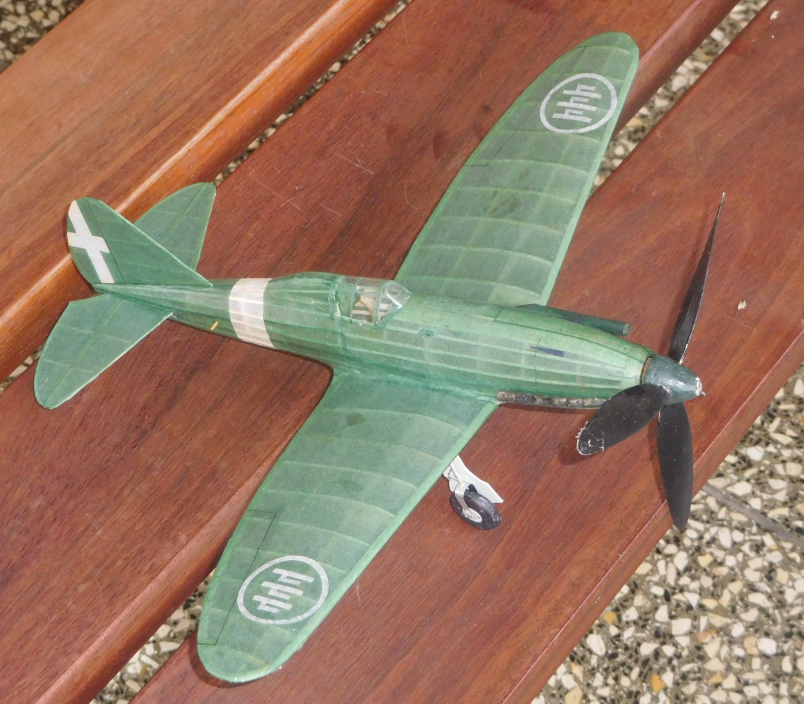 Velmi dobré zkušenosti s maličkou polomaketou Martin Baker MB-5 kategorie living room clas z období covidu 19 mne přměla zkusit tento typ jako NO CALL- MYslel jsem si, že ušetřím čas použitím vrtule s ložiskem z neúspěšného předešlého typu. MB-5 má téměř stejnou obrovskou plochu křídla, ale také dost velká kormidla, takže byl zájem použít na potah to neljlehčí, co je k dispozici - kondenzátorový papír, nepravidelné pruhy šedé a zelené barvy jsem maloval anilinkami, po uschnutí byl papír dosti krabatý, snaha o vyrovnání žehličkou, byla úspěšná tak na půl. Doufal jsem, že hotový potah vypnu po navlhžení vodou, omyl na barvený a žehlený kondenzátorák již voda dále nevyoíná, Váha po obarvení vzrostla na 11 g/m2, což je pořád o 1/3 méně než moje nejlehčí papíry, Hotový model vážil bez gumy 6,2g. Na svazek z gumy 2,5g/m se choval naprosto stejně jako předešlý typ, občas stabilní let z ničeho nic přešel do pádu, ale po dotyku vrtulé se zemí provedl srovnání a při zemi hezky letěl. Bylo mi jasné, že model je těžký na zadek a má malý úhel seřízení, Dovážení modelářským špendlíkem do náboje vrtule, zvětšení úhlu seřízení a nový svazek z gumy 3,4 g/m model oživilo, ale začaly problémy s pevnosí trupu, který se silně prohýbal již při polovině z max otáček. Zpevnění motorsticku uhlíkem pomohlo, bylo však zapotřebí další dovážení. Nyní je jasné, že zadní závěs měl být o pole v předu a odpadlo by ono dovažování. Problémem zůstává měkké ložisko a potřeba často dolaďovat úhel osy vrtule. Nyní je již váha prázdného modelu 7.4g a protože chci létat na svazek z gumy 2,5 g/m, tak jsem musel zmenšit průměr vrtule z 240 na 215mm. Rozhodně to nebude rekordní model. Pokud se letové vlastnosti výrazně nezlepší, pak bude následova přesun zadního závěsu o jedno pole dopředu, odbourání dovážení na prázdnou váhu 6,4g, pokud ani toto nepomůže tak to poslední,co mohu udělat je nové tuhé ložisko. Nepomůže li ani toto, tak jinak hezký model skončí v popelnici.