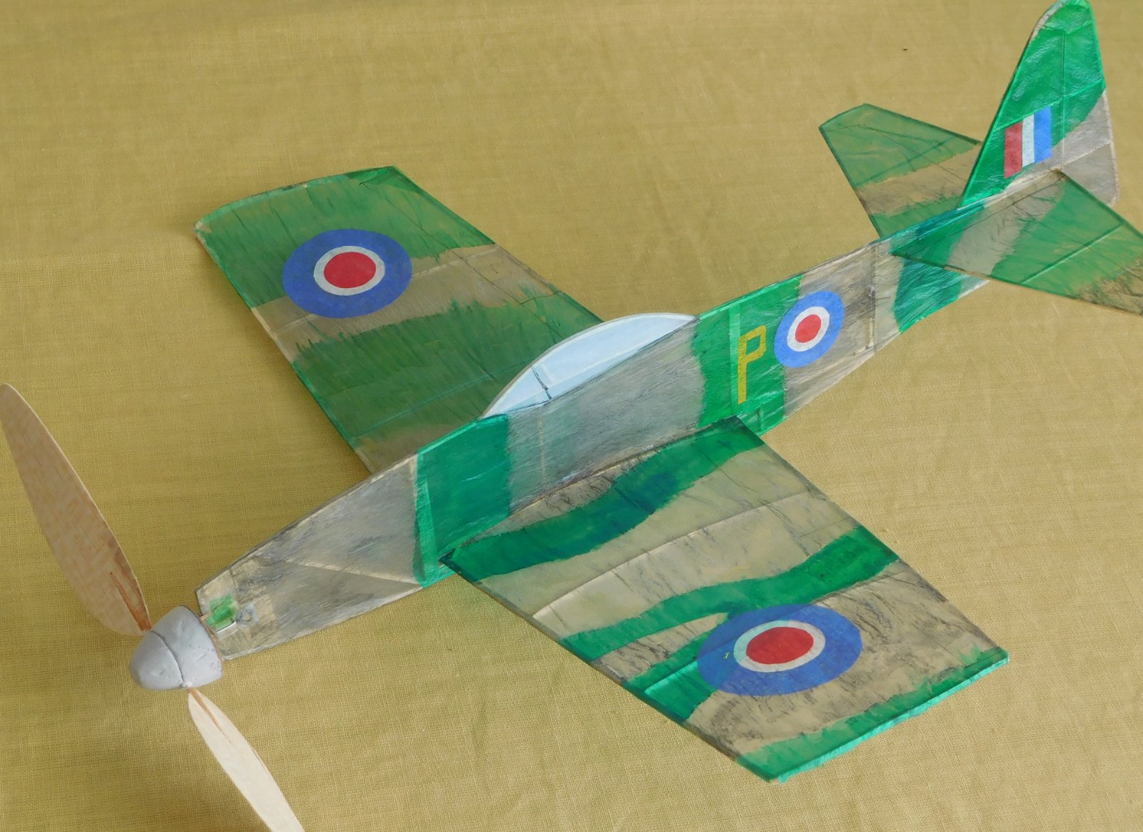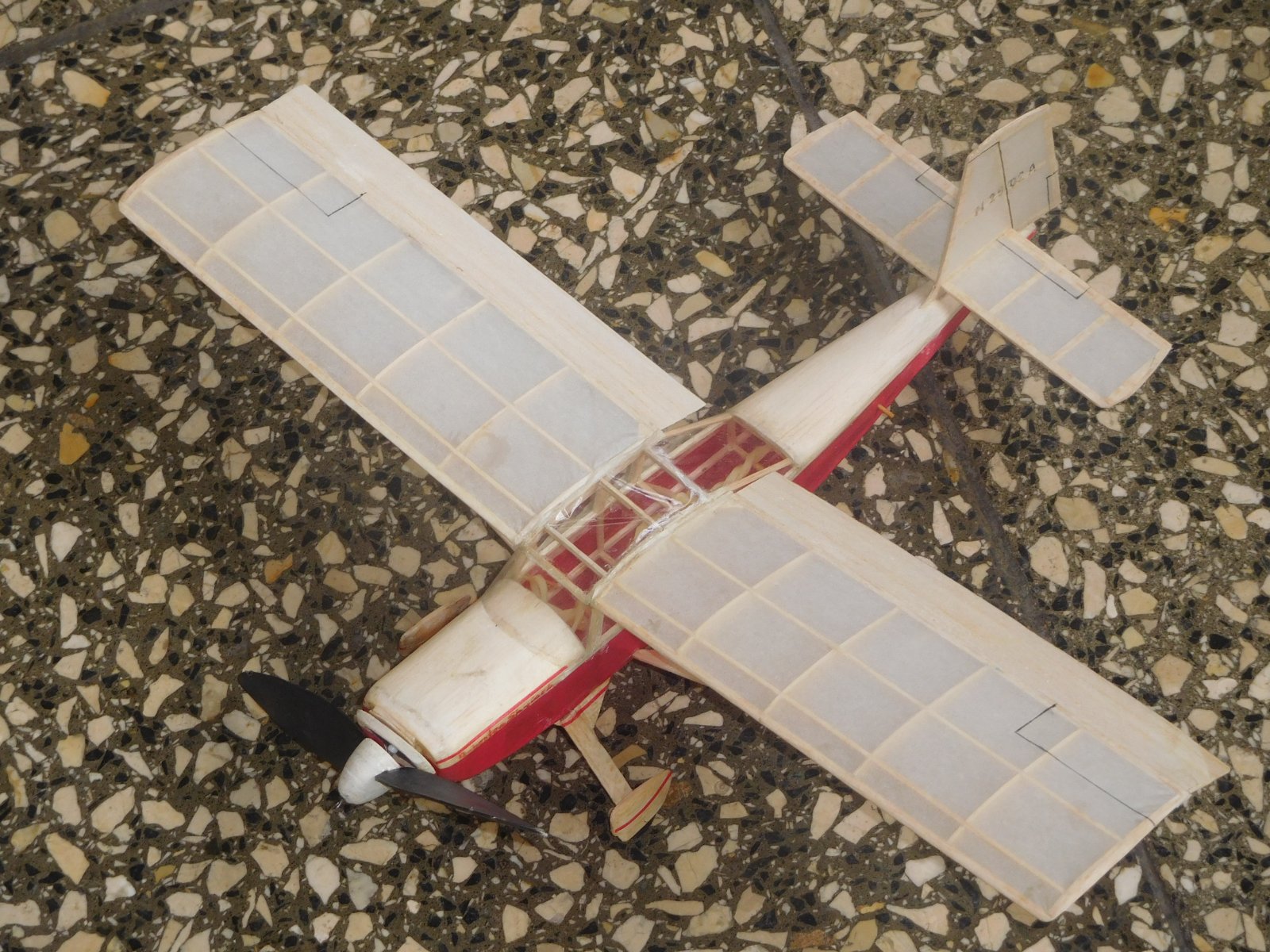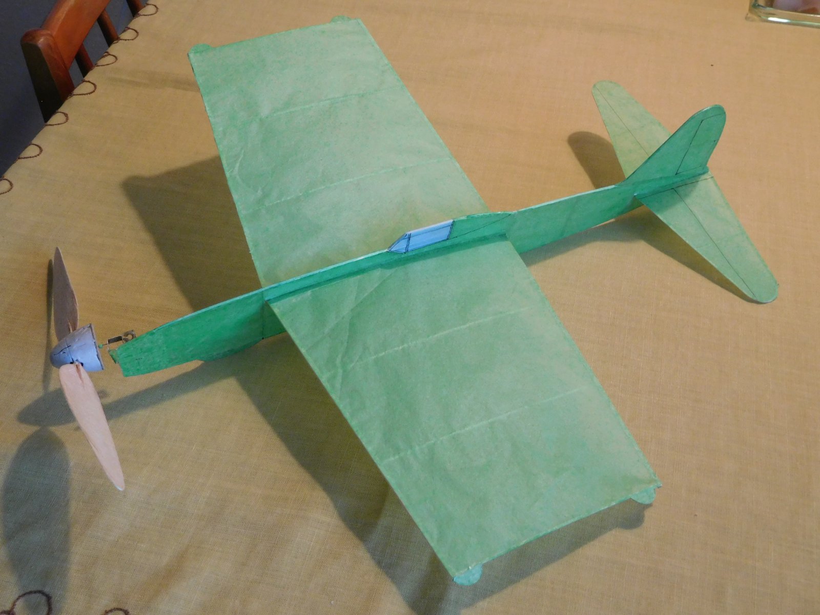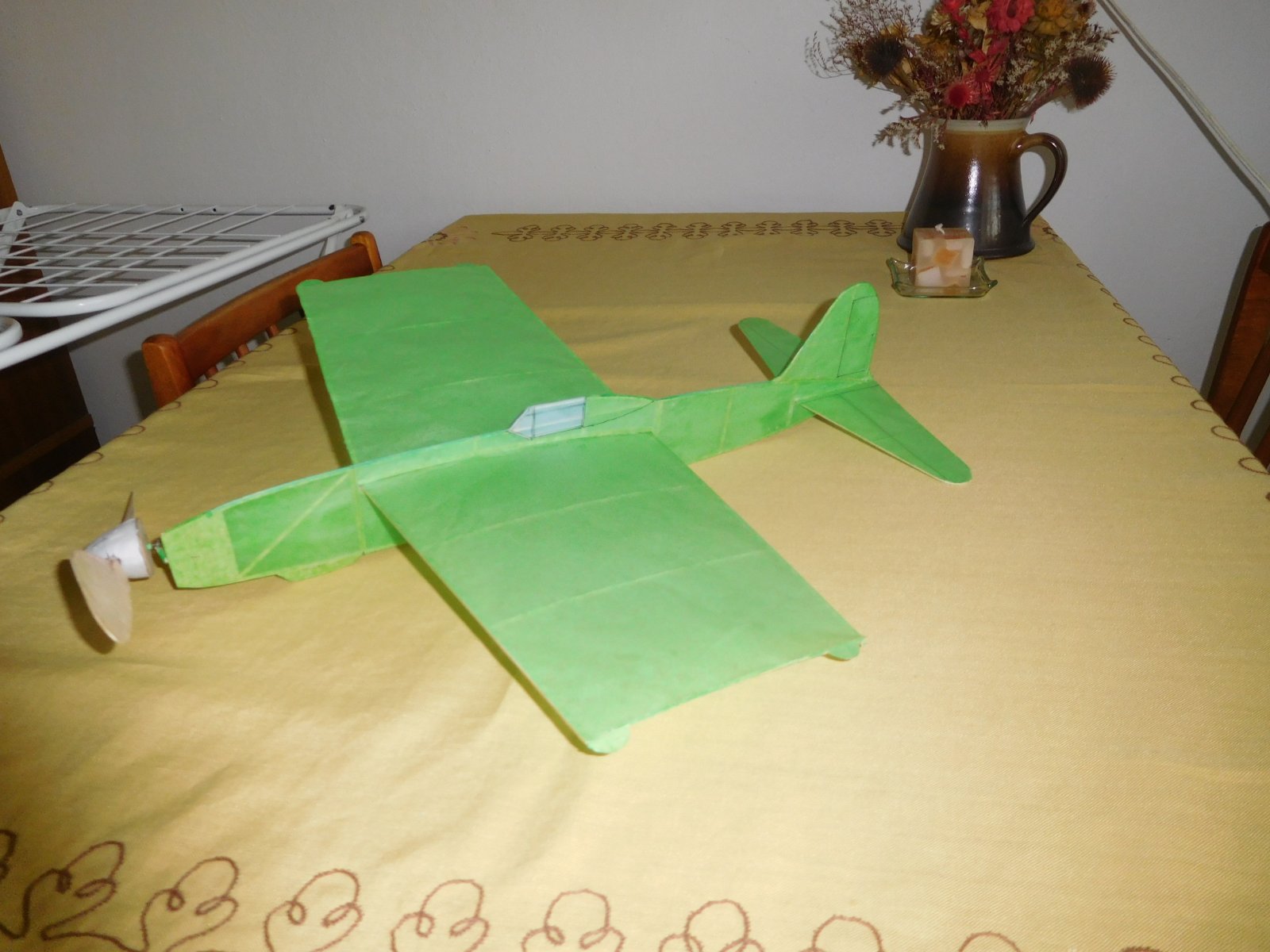 Musím se přiznat, že honbou za co největší plochou křídla a štíhlým trupem jsem si vybral typ, který bude mít jako model problém se stabilitou, VOP je malá a musí mít záporný úhel nastavení i když profil má velmi malé prohnutí. Obrovská plocha křídla vyžaduje superlehký potahový papír, nenašel jsem již dost zeleného Plyspane, asi by to chtělo obarvený, nebo stříkaný kondenzátorák 7 g/m2 a pak by váha vyšla rozumně. Zkusil jsem šikmá léta na listech vrtule, to byl největší omyl, každý náraz znamenal šikmou zlomeninu listu vrtule.