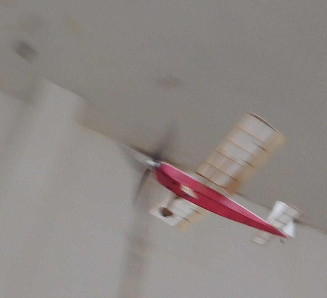 Jeden z typů letounů se zatahovacím podvozkem a které mají největší plochu křídel je právě Keith Rider R-2 a jeho žluto červená barevně zajímavá verze z r , 1933.. Od počátku mi bylo jasné, že bude potřeba větší tah vrtule, takže si to žádá větší průměr ´180 mm a podstatně silnější svazek, ovšem relativně malá plocha VOP neumožňuje větší prohnutí profilu křídla, jinak budou problémy se stabilitou. Model jsem dokončil 16.4. a hned šel vyzkoušet do haly v Krpoli. Velká locha, znamená i patřičně větší váha potahového papíru, i když křídlo, VOP, SOP i zadek trupu jsou potaženy Plyspane 13 g/m2, tak podstatná část velkého trupu má americký, červený papír 17 g/m2 a tak po nutném dovážení Pb 0,7g na středu vrtule vzrostla prázdná váha na 6,2 g. První svazek původně určení pro JUDY K=12 l=420 1,7 g/m byl použitý pouze pro seřízení zatáčky a vyosení vrtule, jinak byl slabý a model nevystoupal výše jak 2m. Druhý svazek z gumy TAN SS´ l´= 490 1,87 g/m původně určený pro Mr. Smoothie byl ten správný, nejprve pár letů pro focení a pak postupné zvyšování otáček až na 1800, kdy výška byla těsně pod stropem 9 +m a čas rekordních 133s.