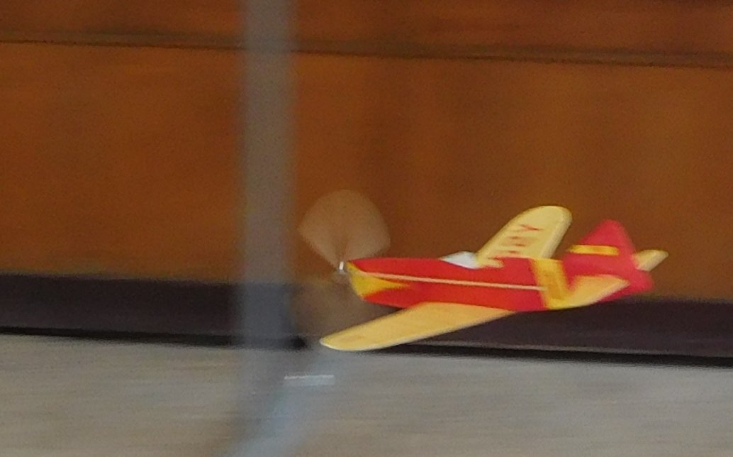 19.4. v Krpoli při 15 C jsem zkusil použít svazek z gumy 01//2015 l=400 2,8 g/m která má potřebný moment již při nižších otáčkách Nmax.=1700 ot. Při 1350 ot,. byla výška 8m čas 70s při kontaktu se stěnou nad WC, Ochotný mladík vylezl nahoru, ale při sundávání rozlámal levé křídlo. Takže oprava až doma a při tése podařilo zabudovat i potřebný positiv na levém křídle, který jsem dosud musel před startem nakrucovat a on se během letu ztrácel, jsem zvědavý jak se to projevína změně průměru okruhů (dosud se ke konci zatáčka otevírala a model občas narazil do stěny)..