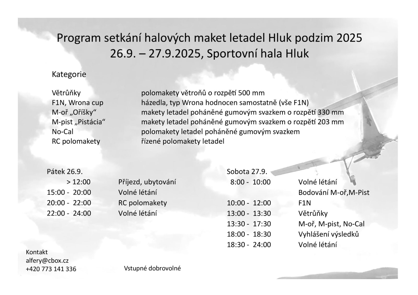 Jak jsem avizoval při letošní jarní akci, pro podzimní termín provedu nějaké změny. Nejprve připomenu, že úplně na začátku jsem jasně řekl, že vše bude probíhat v naší vlastní režii – finanční i personální. Pokud se financí týče, tam prozatím problém není a doposud jsme se vždy na halu složili. S personálním obsazením je to horší. Smířil jsem se s tím, že si moc nezalétám a budu se starat o to, že si zalétají ostatní. Ovšem pokud není ani ochota obodovat Oříšky a Pistácia, je namístě položit si otázku, zda jejich soutěže mají smysl. Je to spíše komedie či tragédie – záleží na úhlu pohledu. Celá akce je koncipována především jako setkání s dostatkem času na zalétávání nových modelů, ladění těch starších a výměnu zkušeností. Z tohoto hlediska vlastně nejsou soutěže Oříšků a Pistácií nutné – pro mne to bude jednodušší. Vaše volba – bez statiky nebude ani letová část.