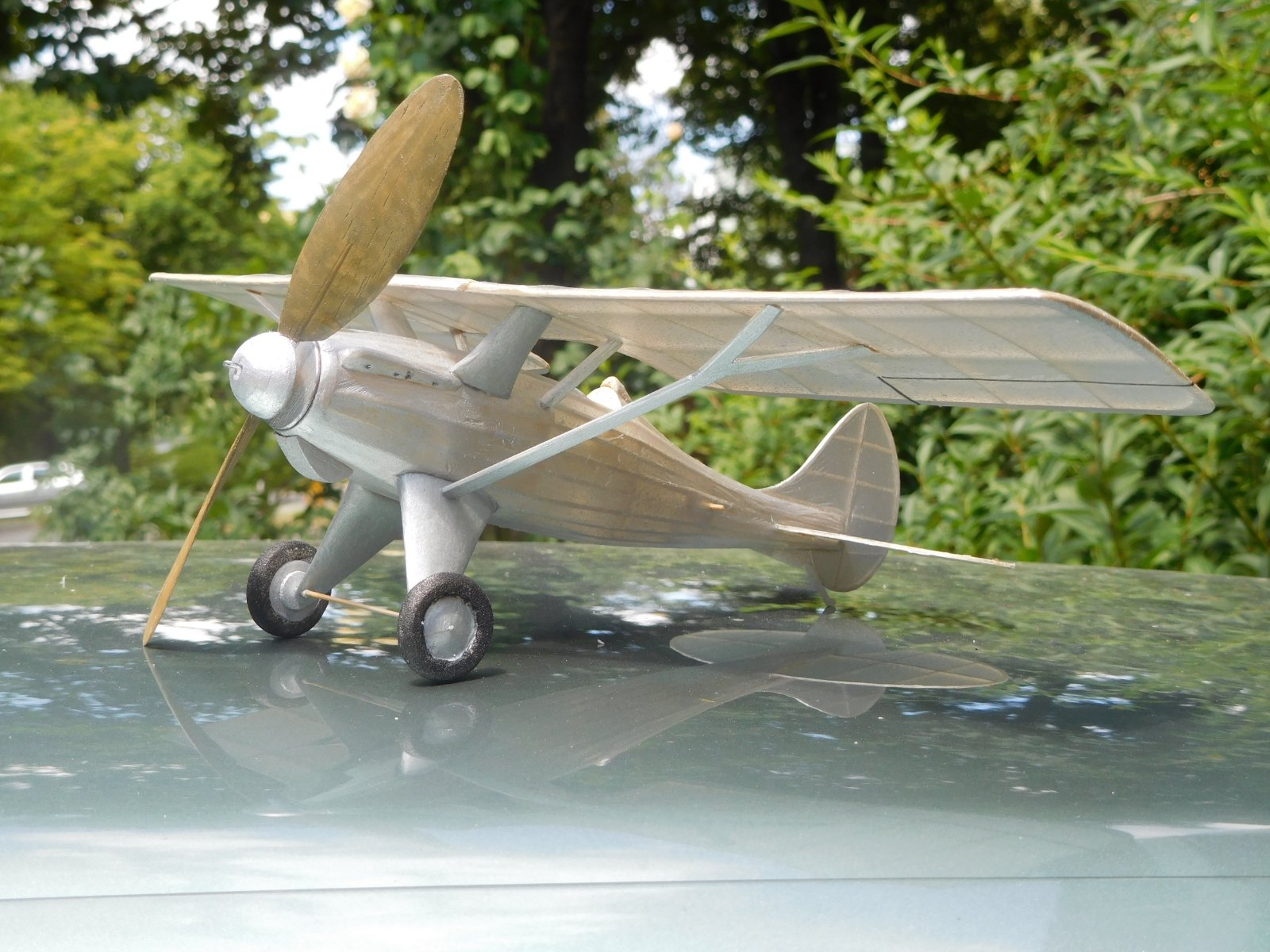 Jano konečně dostal gumičku do jeho oříška hydroplánu Supermarine S.4, říká natoč tam jen 600, je tam silnější gumička od Kubeše a hoď to ty. Následuje moc hezký let. Říkám model je v pořádku natoč si 1000 a poletíš ty sám. Tak letěl a moc hezky asi 40s, jen na konec motoru zůstal větší uzlík vzadu a model v kluzu houpal. Je potřeba ten svazek otočit předkem dozadu, aby se ty uzly dělaly vpředu, nebo gumičku kjrátit. Zato jeho zvlhlý Fokker D-VIII se choval jankovitě, snad jen jeden let, kdy jsem mu na křídle nakroutil větší negativ byl hezký. Ve 14 přijeli Tom s Ivošem, Tomovi moc hezky létal jeho BV-1 TUBBY a také s Ivošem ladili seřízení u dvacetinky Jupiter.
