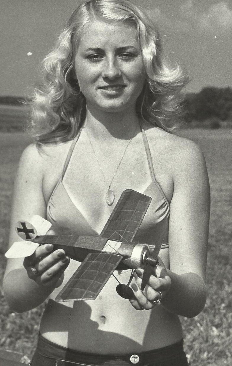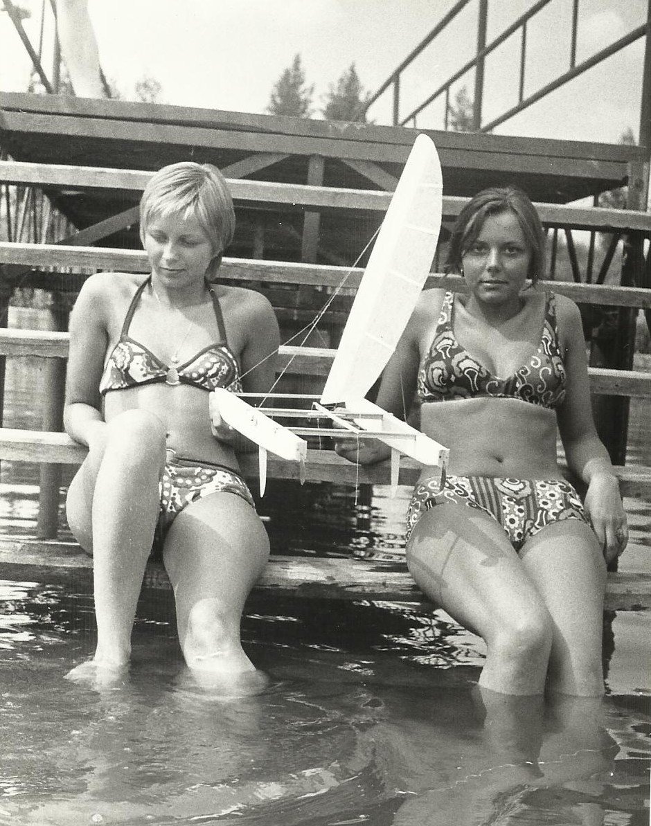 K tradičním účastníkům vždy patřila rodina Hladíkových, Šáša postavil hned tři Sopwithy Triplane, ten starší upiplaný s velkým véčkem výborně létal, nový docela hezký, těžší pak bodoval ve statice, nikdo se dlouho nevyznal, který let patří ke kterému s modelů, až ing. Šmahem na ně přilepil malá čísla a bylo po problému. Pokud to v týdnu hodně foukalo, pak jsme byli u vody na přehradě a Karel Ludvík postavil báječně jezdící katamaran, fotka ukazuje holky z druhého břehu, kde měly stan a Karel naprosto neomylně nastavi katamaran tak, že přistál přímo k nim. Pak po velké plavbě přes celou přehradu nestačil ten svůj výtvor sledovat, místní kluci na kolech byli rychlejší a ukradli jej, on ale postavil repliku...