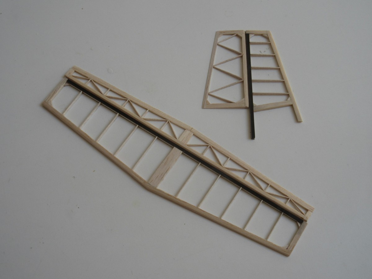 Tak mám připravený ocásky. Jejich hlavní nosník jsem zkusil slepit ze dvou uhlíkových pásků (3 x 1,5 mm). Sice se opravdu neprohnou ani omylem, ale v krutu samozřejmě žádná velká změna a vzrostla váha: SOP váží 1,3 g (z toho 0,6 g uhlík), VOP 3,1 g (1,3 g uhlík). Tak nevím, zda je to vůbec k něčemu dobrý...?