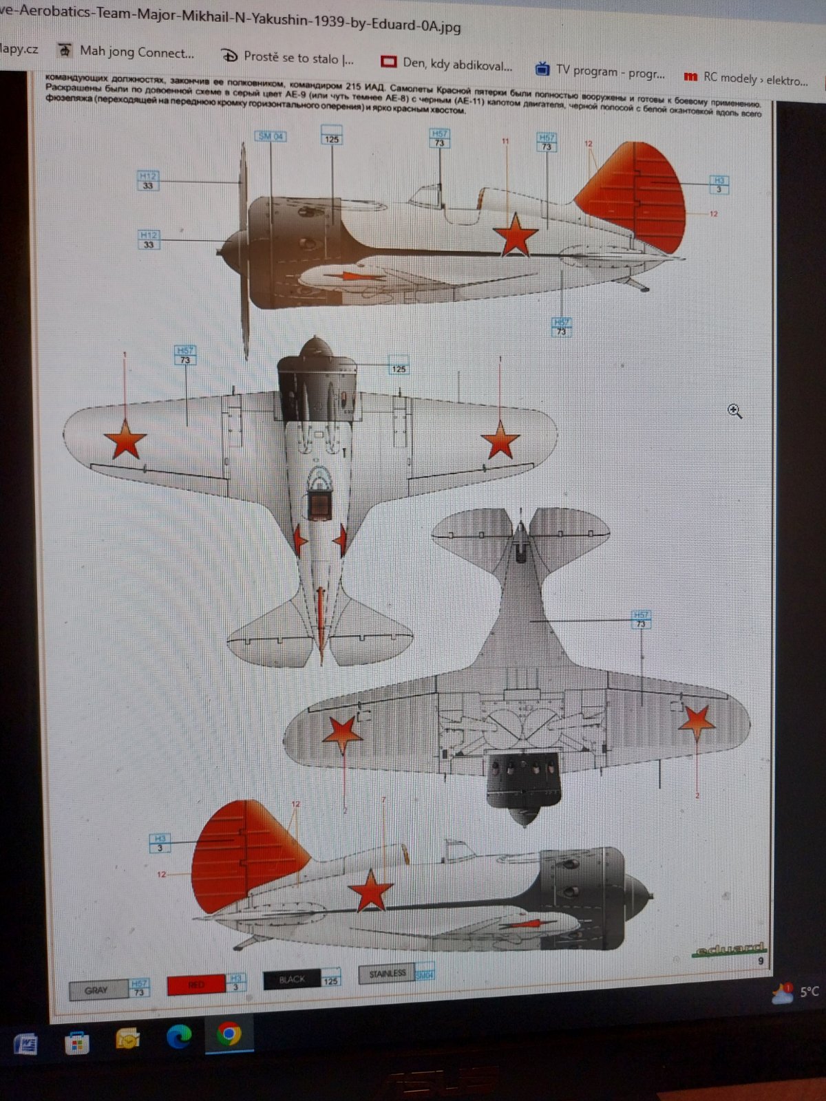 Tak jsem dnes obarvil papír na Jaka a I-16. Barvil jsem nešustivý japan 12 g co prodáva Hořejší. Světle modrou na spodek Jaka jsem zkusil stříkat hodně zředěnou modrou tuží .První menší kousky papíru dobrý ale pak jak už byl umatlaný podklad (celofán) tak už to nebylo dobré (mapy, podstříknutá tuž. Asi byla chyba že jsem stříkaný papír uchytil páskou jen v rozích. Na ostatní barvy světle šedá na I-16 a červená na hvězdy a problematické konce křídel Jaka jsem použil vykoušený a osvědčený způsob Jirky Tramfala a jsem spokojený. Další modely už budu asi jen stříkat pistolkou